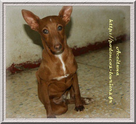 | Dire merci | Je remonte pour une petite pod à adopter .... Ou même à parrainer pour pouvoir l'opérer Je vous laisse regarder la vidéo de la jolie puce Lien ![]() Cette petite podenca a été trouvée dans la rue, il y a déjà quelques semaines de cela. Nous l’avons recueillie et pouvons vous dire qu’Aceituna a un caractère formidable. Elle ne pleure pas, ne fait aucune bêtise quand elle est seule alrs qu'elle est si jeune. Elle aime beaucoup la compagnie des humains ainsi que dormir à nos côtés, sur un canapé. Elle est vraiment incroyable de gentillesse et de tendresse Elle a un problème à une hanche certainement du a une fracture non soignée et les os de sa patte se sont déplacés, cela lui provoque une boiterie accompagnée d’un peu de douleur. Peut-être qu’une opération l’a soulagerait, vu qu’elle est très jeune et a donc toute la vie devant elle pour en profiter. Aceituna est OK chiens Taille : Bébé actuellement mais 30 cm maxi à l'âge adulte Poids : 3.5 Kg ( en janvier 2013) |