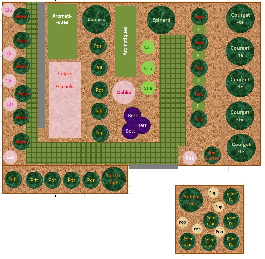 | Dire merci | Voila le plan.. Qui sera surement modifié d'ici que tout soit planté, maiq ca me donne les grandes lignes, pour prevoir l'emplacement des choses ![]() En rose, fleurs. De gauche a droite, si c'est illisible : fraises, aromatiques, epinards + pommes de terre, epinards + salades + betteraves, tomates + basilic, courgettes. En bas a gauche encore des patates, et une courge plantée apres recolte des patates. Un carré a part pour les courges (et le pop corn au milieu, il parait que ca se marie bien courge-maïs). ![]() |