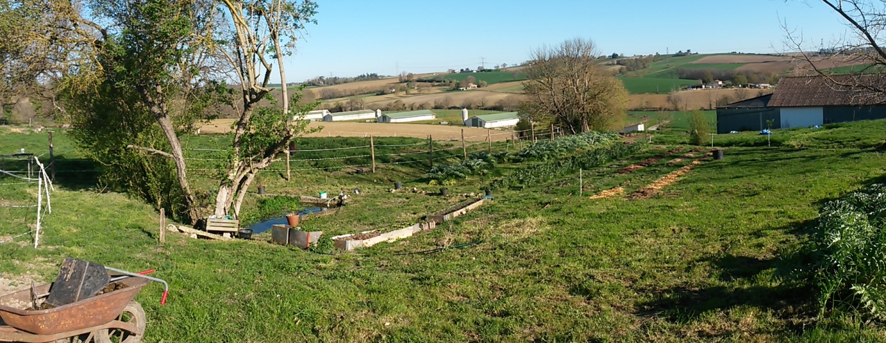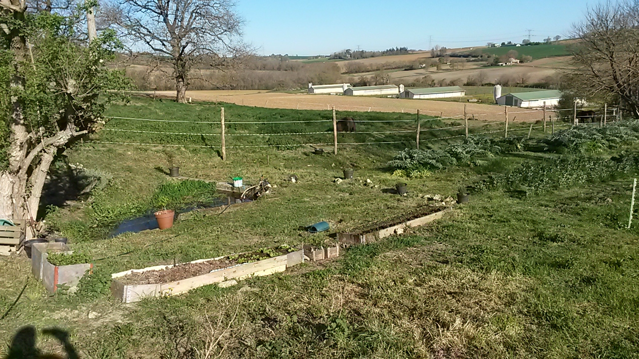 | Dire merci | ![]() ![]() en potager : les artichaut, l'ail, les fèves et les 3 rangs de pommes de terre cultivées en lasagnes (sans labour juste posées au sol et recouvertes de vieux crottins, foin pourri, herbes de tonte, paille) ![]() ![]() |