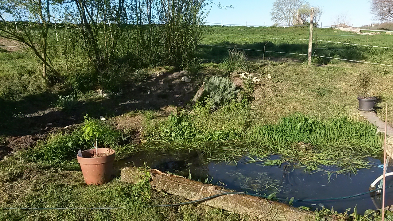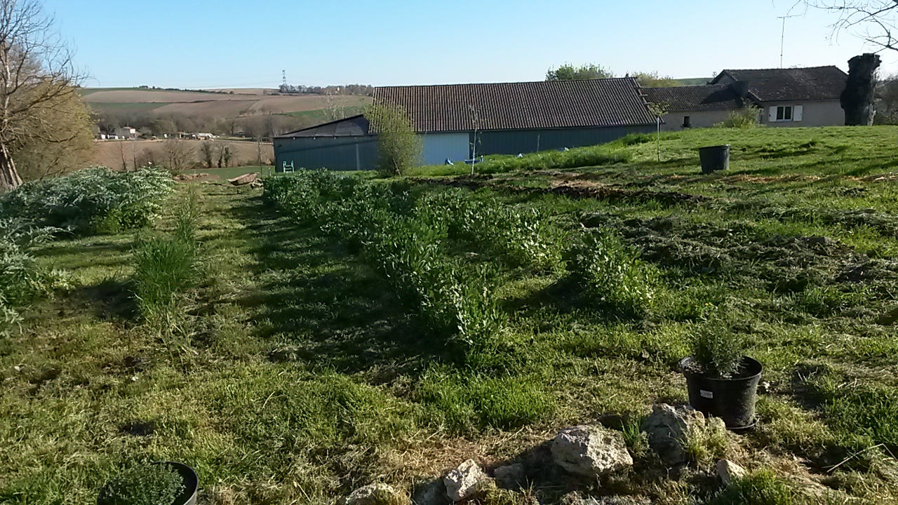 | Dire merci | voici à quoi ressemble mon jardin en ce moment : alors là côté verger le long de la carrière : (2 oliviers, un citronnier, deux pruniers, un nectarinier et un pommier) ![]() bon là c'est la vue général en panoramique : ![]() en détail à la source (un framboisier en pot, un laurier rose) et sur la but j'ai du sauge, de la lavande, du thym , du romarin, des noisetiers et du basilic ![]() j'ai mis cette année en pot sauge officinale, thym citronné, romarin, et là j'ai mis des semis de bourrache que je repiquerai autour du jardin quand elles auront 7 ou 8 feuilles dans les carrés potager : sucrines, batavia brune et radis, et de la mauve + batavia blonde dans un autre qu'on ne voit pas) dans les autres caissons : menthe du maroc (pour le thé à la menthe) et encore quelques stolons de fraisiers que je n'ai pas encore repiqué) ![]() |