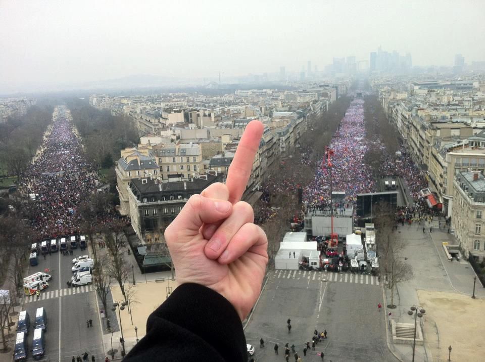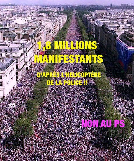 DéconnectéDire merci | Ben, c'est un classique, le nombre est souvent gonflé par les organisateurs et diminué par les forces de l'ordre. Pour la photo, je vois un doigt qui montre une fenetre de toit non conforme à la réglementation thermique!hum! pas catholique! |