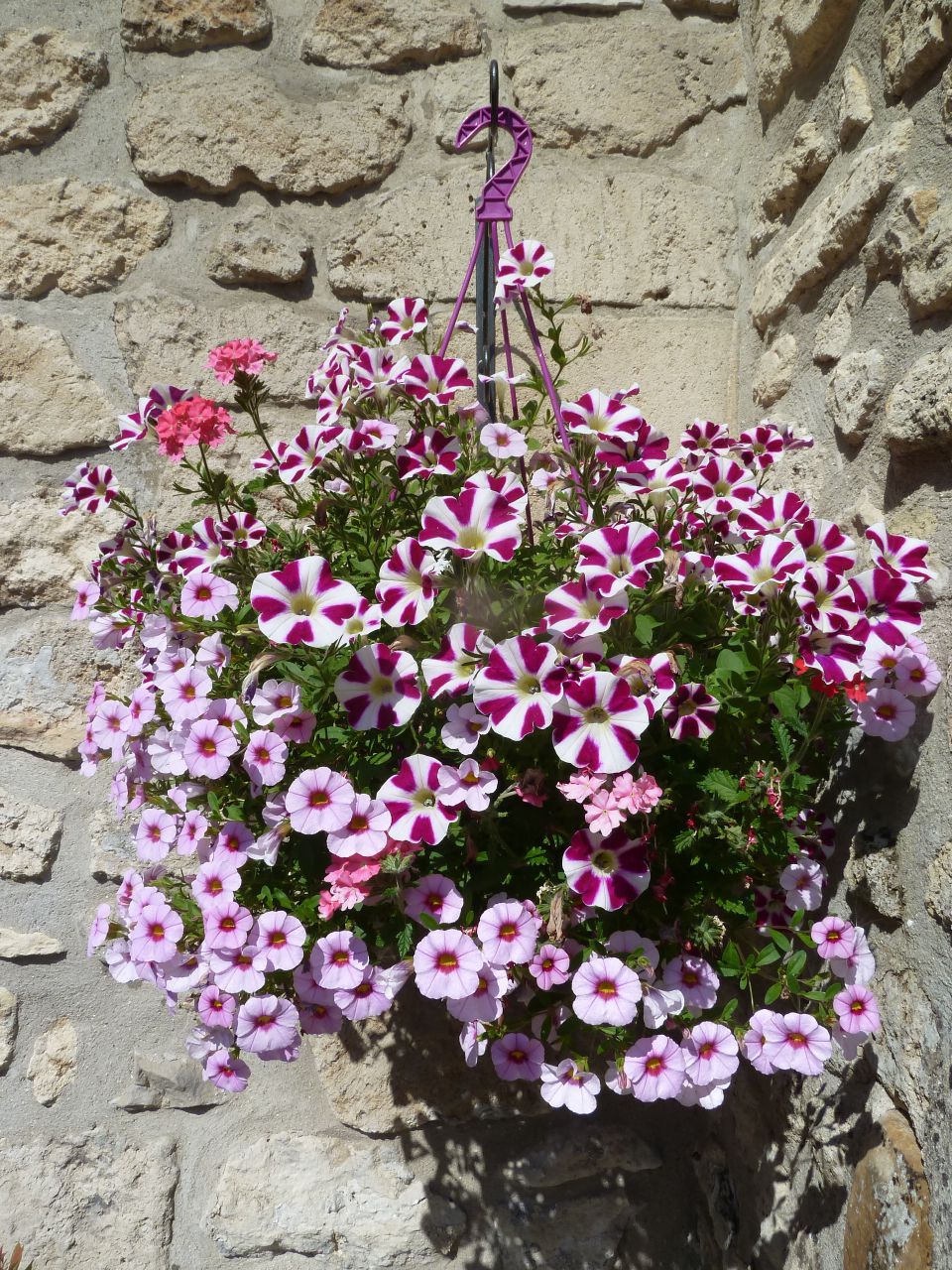| Dire merci | en pot au soleil, tu as pas mal d'annuelles d'été : surfinias, verveines, pétunias, anthemis, gazanias, géraniums. voilà une suspension que j'ai fait l'an dernier avec un mélange de pétunias et de verveines ![]() |
