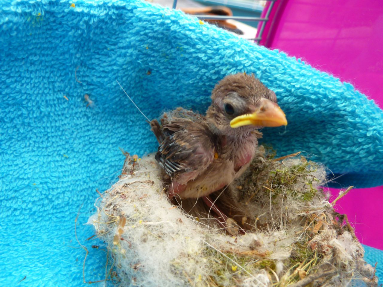 | Dire merci | le mien (ou plutôt la mienne, c'est une fille ! ) est un moineau tout bête, tombé du nid dans mon sac de pansage en août dernier. pour le moment elle est à la maison parce que je ne veux pas la lâcher l'hiver et encore moins chez moi à cause de mes 5 chats. en mai, je la lâcherai aux écuries .... enfin, si j'en ai le courage parce qu'elle s'est beaucoup attachée à l'humain et j'ai peur qu'elle ne sache pas se débrouiller dans la nature. au début je l'ai nourrie toutes les heures nuit et jour et je l'emmenais partout, elle s'est tellement bien habituée que je ne pouvais même pas faire mon courrier tranquille sans qu'elle vienne m'embêter ![]() |