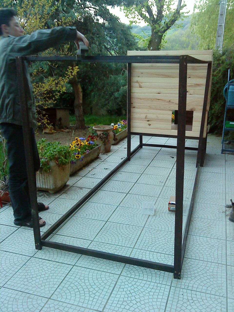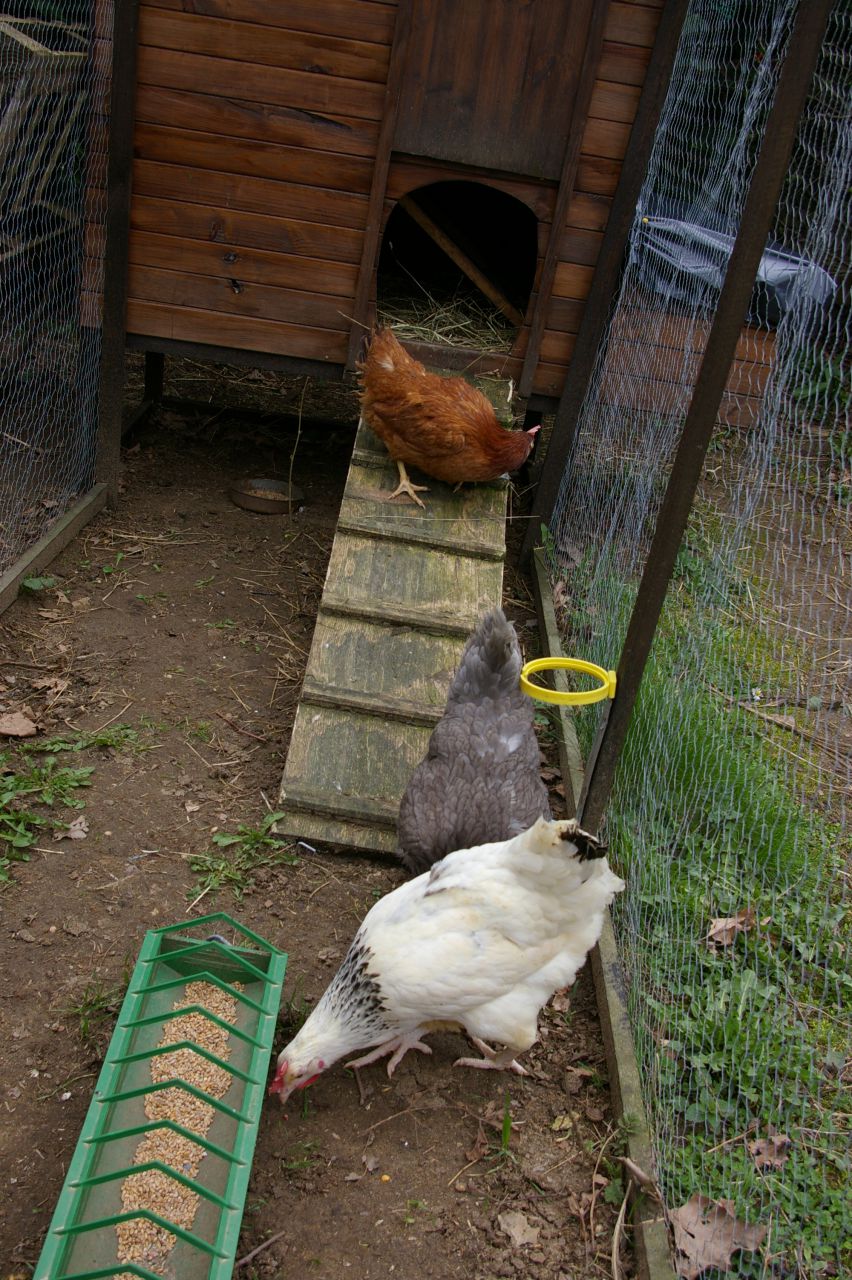 | Dire merci | Etapes de fabrication : (pour se donner une idée, les carreaux de ma terrasse font 30x30) ![]() ![]() ![]() (bon, depuis, j'ai mis l'échelle intérieure dans l'autre sens, elle est moins "raide" à monter", les poulettes vont plus volontier se percher dessus) Sur le côté, on voit l'emplacement du nichoir, amovible. Sur l'arrière, une grande porte permet d'accéder à l'intérieur du poulailler pour le nettoyage. Le toit est simplement posé dessus, il tient par son propre poids (planche de contrecollé, recouverte de schingles, et ça, ça pèse assez). Il reste à sa place car sur sa face inférieure, il y a 4 "cales" aux 4 coins, qui l'empêchent de glisser (c'est un toit en pente) Devant, il y a l'ouverture pour les poules, qui coulisse vers le haut. Je ne rentre pas dans la cage pour ouvrir ou fermer, il y a une ficelle accrochée en haut du volet coulissant, qui monte jusque sous le toit, entre dans le poulailler par un petit trou, traverse le poulailler, et ressort sur l'arrière par un autre petit trou. Un anneau est fixé au bout de la ficelle. Pour ouvrir, je tire la ficelle, ça remonte le volet, et j'accroche la ficelle à un clou planté sur la face arrière du poulailler, pour faire tenir le volet relevé) |