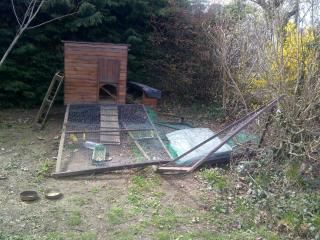 | Dire merci | La cage est amovible![]() Ici, on aperçoit le nichoir sur le côté (il est amovible lui aussi) : c'est une caisse ouverte sur la partie qui se fixe au poulailler, avec un toit abattant, qui permet d'aller récupérer les oeufs sans entrer dans le poulailler) ![]() Sur la photo, il y a eu un accident.... ![]() Mon homme est tombé sur le poulailler en élagant le platane... La cage est détruite (dommage, elle était bien, et je n'ai pas encore eu le temps de la reconstruire) On voit que le pondoir est décroché du poulailler, à cause de l'accident. On l'aperçoit un peu à travers la cage sur cette photo là, et on voit aussi l'échelle perchoir dans sa nouvelle position (le plastique noir, c'est parce que j'ai un petit souci d'étanchéité du petit toit) ![]() |
