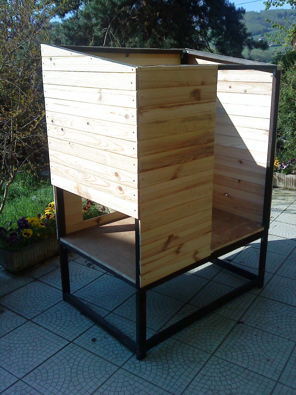 | Dire merci | Fait maison, par mes soins (avec aide du fiston et du zhom pour les assemblages)![]() Capacité max : 6 poules. Tout en matériaux de récup qui trainaient chez moi. Du lambris, des gros tasseaux, des planches de contreplaqué, des restes de shingle pour la couverture (bardeaux bitumeux), une chute de revêtement de sol plastifié pour recouvrir le plancher (facilité de nettoyage et meilleure hygiène. J'ai acheté les charnières, les loquets et le grillage (ça, c'est cher, je trouve) |