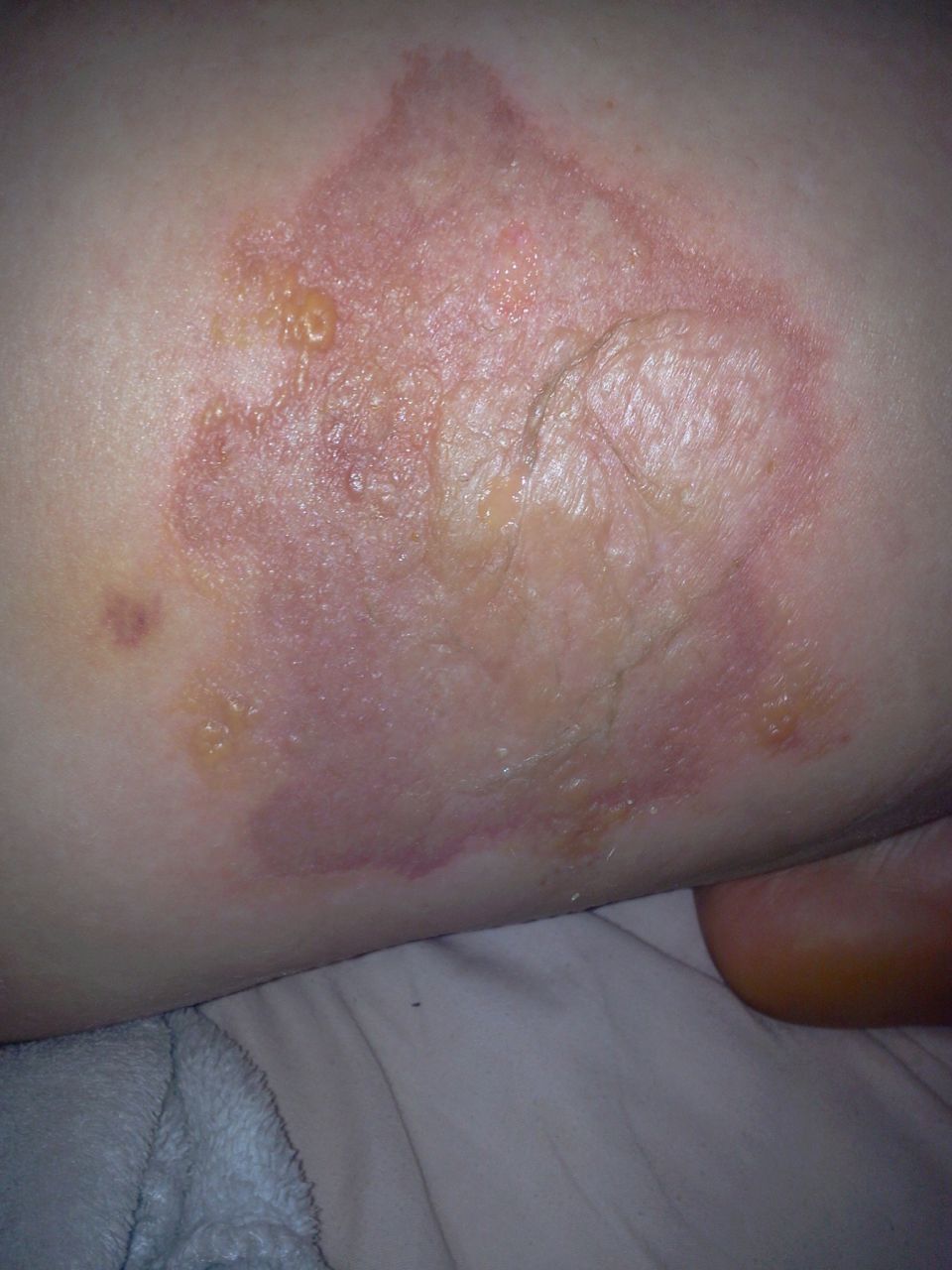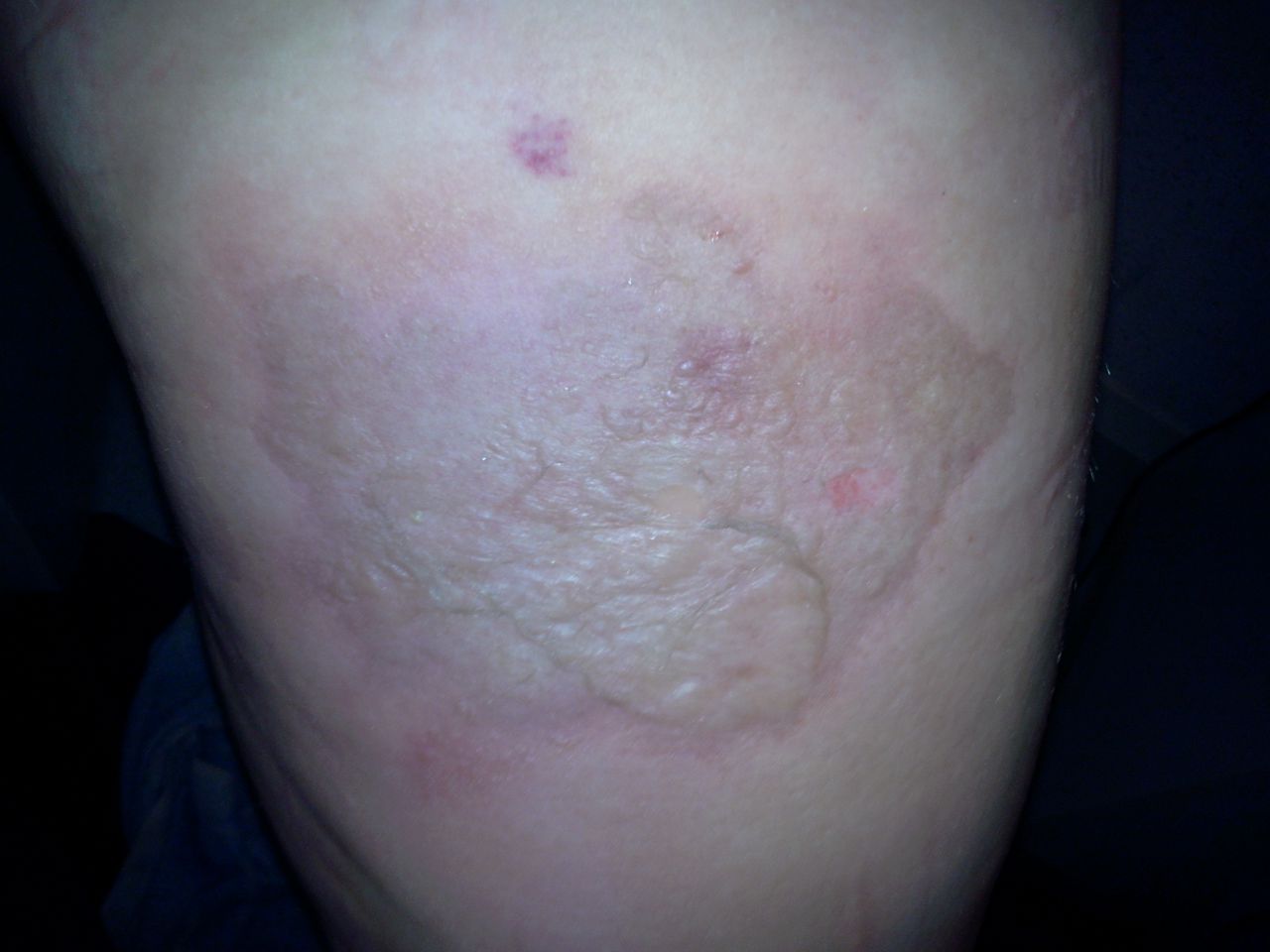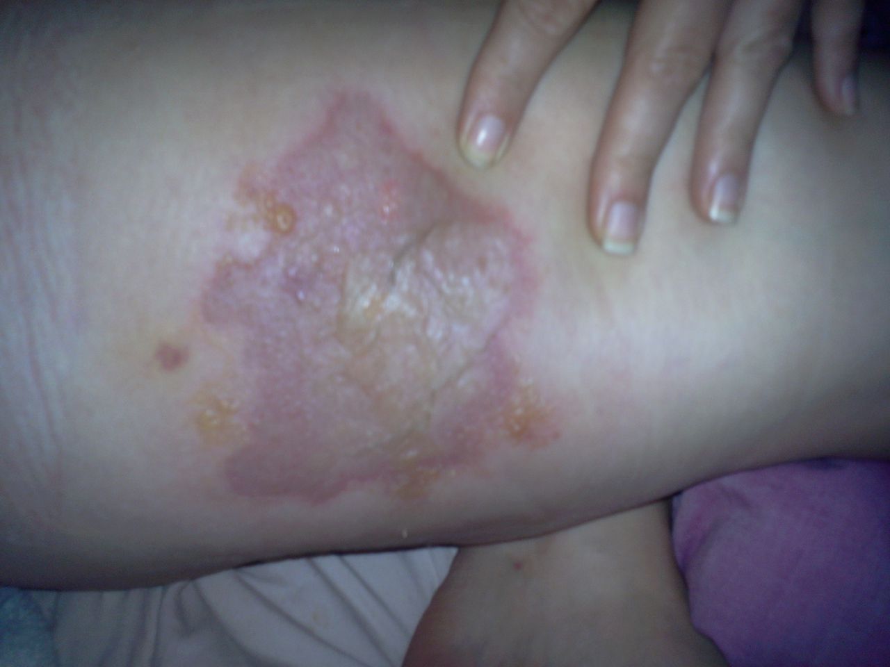 | Dire merci | allez! photos de ce soir! je trouve la brulure bcp plus jolie que hier. la peau des cloques s'est "desolidarisée" et ne fait plus que une giga grande cloque. une amie infirmiere me dit de l'enlever et de desinfecter. mais j'ai pas trop envie de me retrouver avec la peau rouge brulee a vif... ![]() en spoiler, ame sensible s'abstenir |