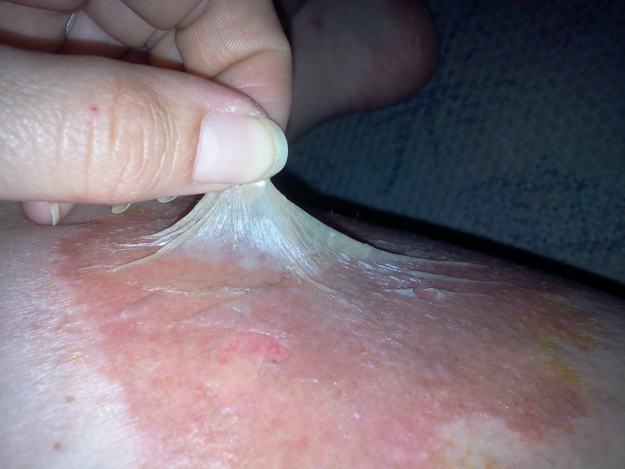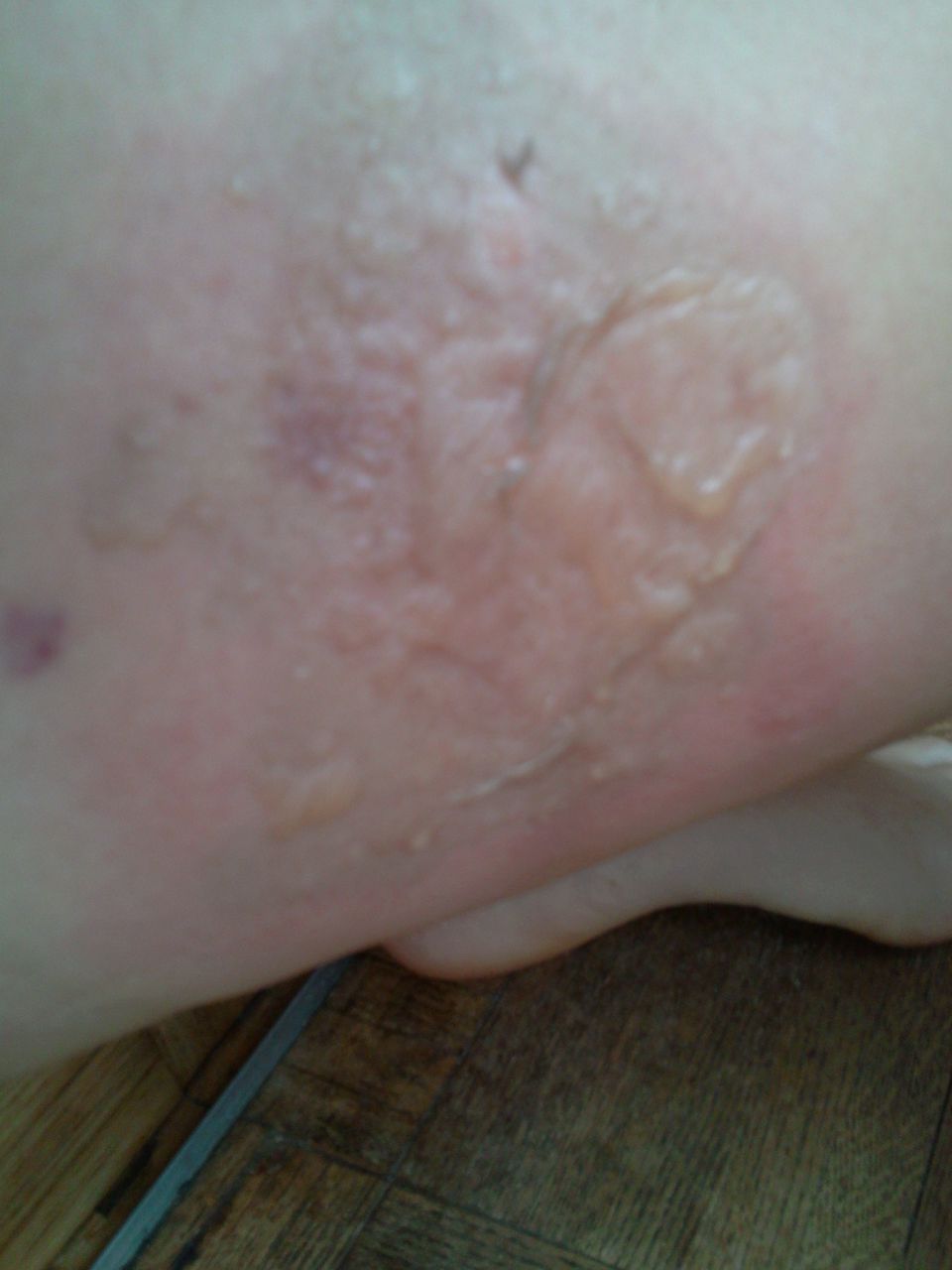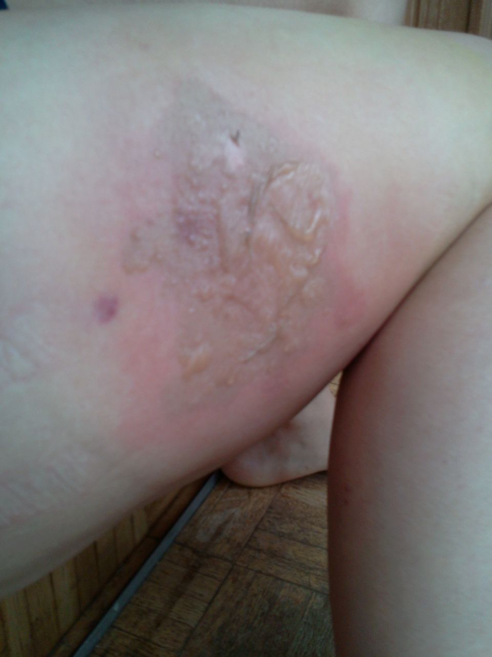 | Dire merci | allez! photos de ce soir! je trouve la brulure bcp plus jolie que hier. la peau des cloques s'est "desolidarisée" et ne fait plus que une giga grande cloque. une amie infirmiere me dit de l'enlever et de desinfecter. mais j'ai pas trop envie de me retrouver avec la peau rouge brulee a vif... ![]() en spoiler, ame sensible s'abstenir |