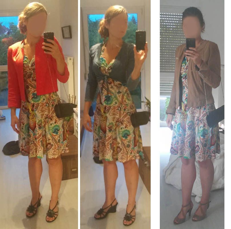 | Dire merci | alors voici une version alternative avec mes chaussures taupes et mon blouson en cuir ... est-ce que ce n'est ps assez chic ?![]() la pochette noire choque-t-elle ? une copine peut peut-etre m'en preter une vert flash dans les tons de la robe qu'en pensez vous ? pour le bolero bleu tapez 1 pour le veston rose tapez 2 pour la veste en cuir tapez 3 merci de votre aide Message édité le 17/08/15 à 22:38 |