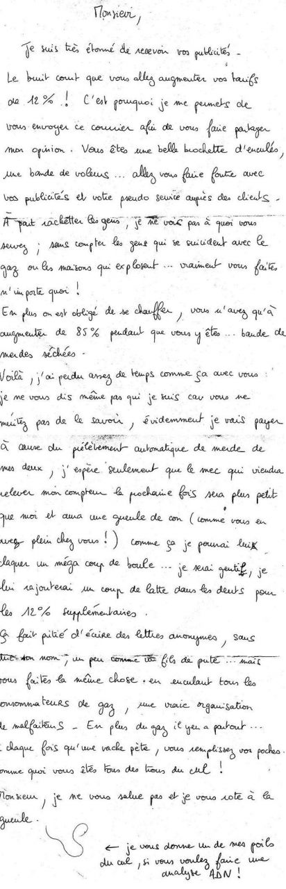 | J'ai la lettre hier j'ai bien rigole, j'adore le coup du poil de cul