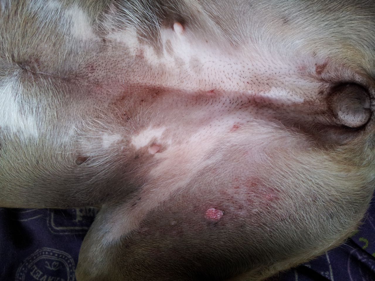 | Dire merci | mon caniche faisait des irritations comme ça , je lui passait un lait acheté chez le véto et ça soulageait direct, il s'agissait en fait d'une sensibilité aux herbes qui lui gratouillait le ventre quand il venait au pré avec moi...rien de méchant |