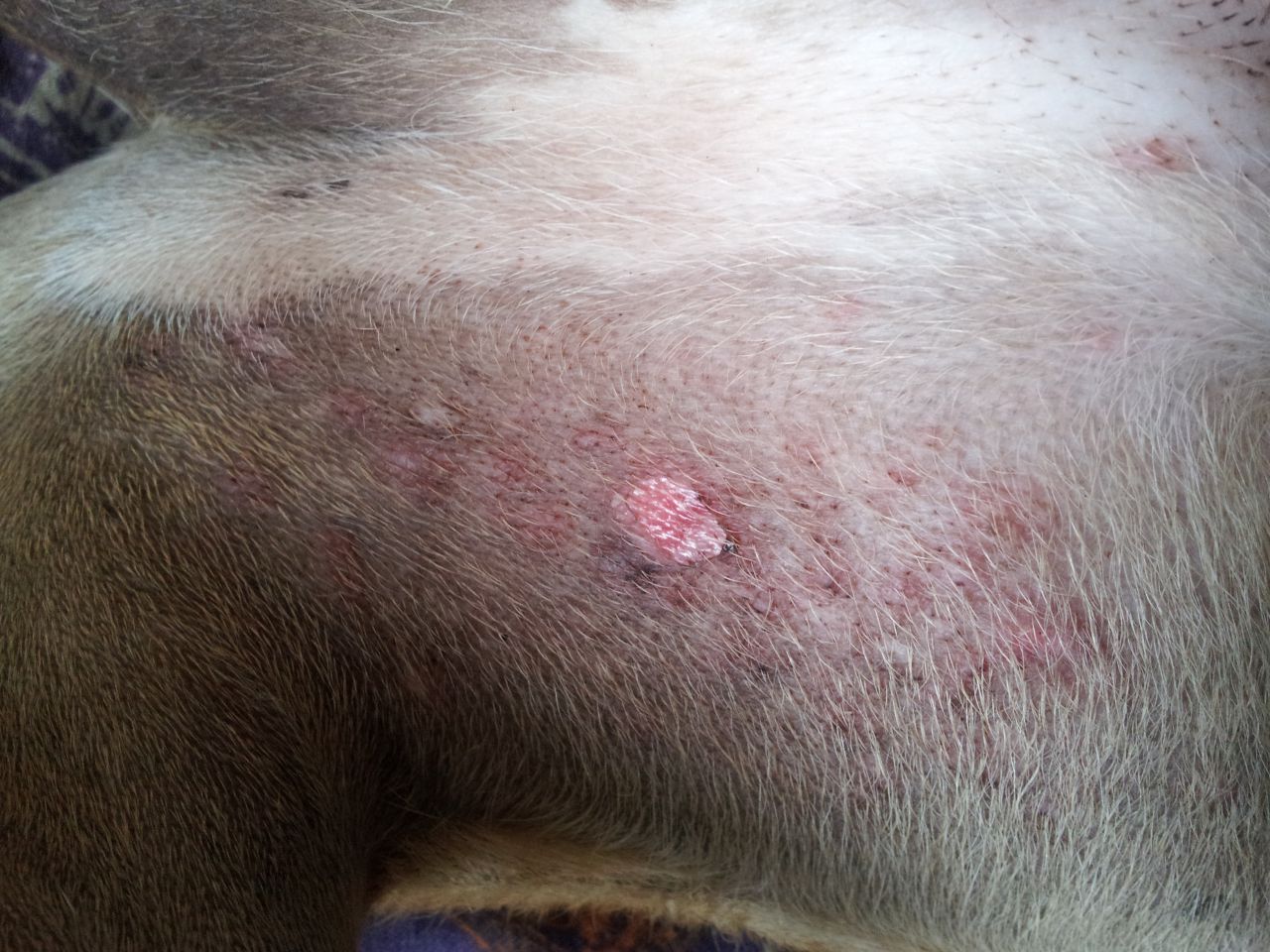 | Dire merci | Non rien appliqué du tout. Et ça fait un moment quelle n à pas été lavée. Donc ça ne peut pas être le shampoing... Elle ne se gratte pas, mais suffit de passer un coton avec du désinfectant pour que la reçu parte en formant les ronds rouges. Je pense à une allergie avec l humidité de son coussin ou lors de ses sorties en foret.. Je vais demander une crème à ma veto en lui montrant les photos. |