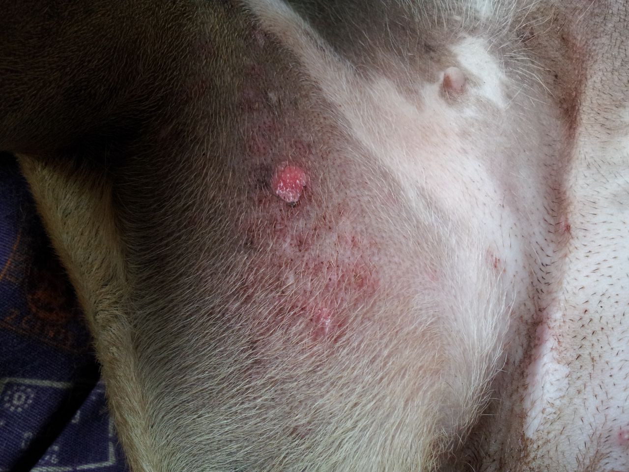 | Dire merci | Bonjour Ma chienne à encore un truc bizarre. Sur le ventre et l intérieur des pattes arrières, elle à des plaques rouges avec des boutons rouges/blancs qui ressemblent à des genres d ampoules. Photos en spoiler, après désinfection. Le rond rouge, c'est quand j'ai passé le coton la peau s est enlevée. Message édité le 22/09/13 à 14:19 |