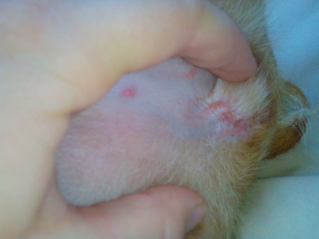 | Dire merci | Bonsoir ENCORE une emmerde avec ma chienne ... Depuis ce matin elle avait des boutons sur la tête (front, entre les oreilles) vraiment pas mal. Ca avait pas l'air de trop la gratter. Du coup tout à l'heure, j'ai regardé de plus prêt et elle en a partout, vulve, entre le haut des jambes .. Je suppose fortement que c'est des aoutats ça fait bel et bien des petites croutes oranges avec des petits boutons. Je vais chez la véto demain voir ce qu'elle me conseille mais je veux bien vos témoignages sur ça ... Vos techniques pour s'en dépatouiller aussi... Pour le moment elle n'a pas l'air de beaucoup se gratter mais ça va venir je pense. ![]() On ne voit pas grand chose, qualité portable.. |