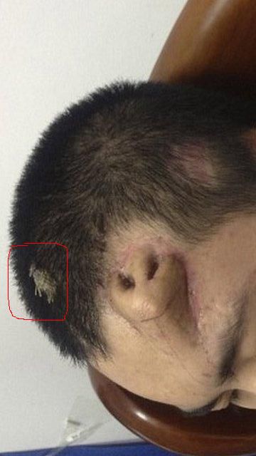 | Dire merci | non mais dans quelques temps, il vont lui remettre à la bonne place, hein, vous affolez pas. Bon, c'est sur que pour le moment, çà fait bizarre! C'est une belle prouesse technique, qui va permettre ensuite une auto-greffe du nouveau nez. |