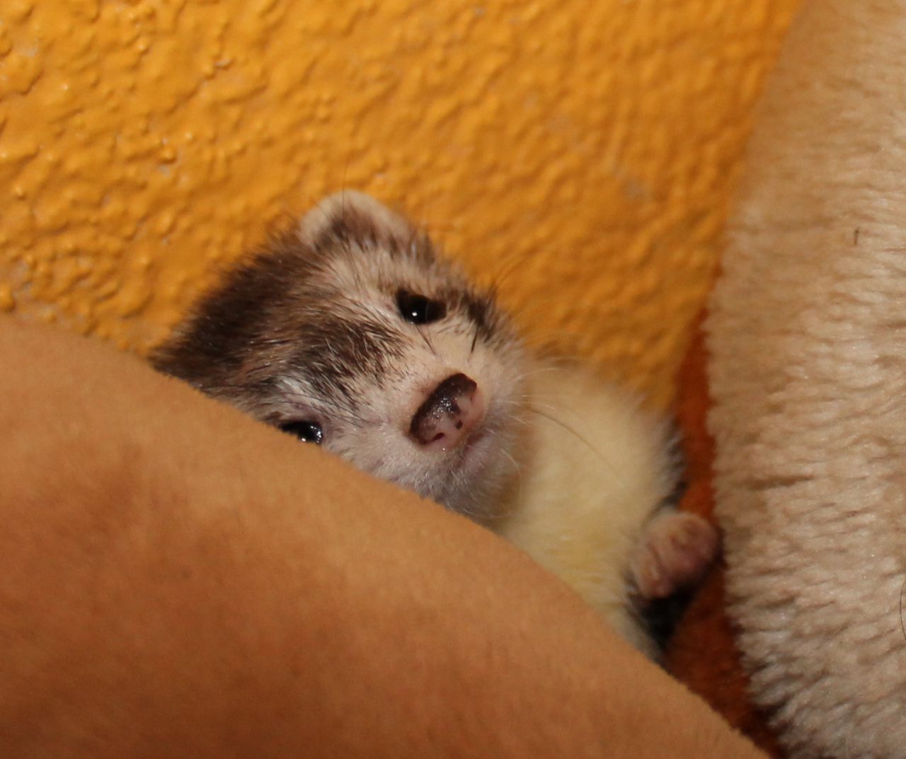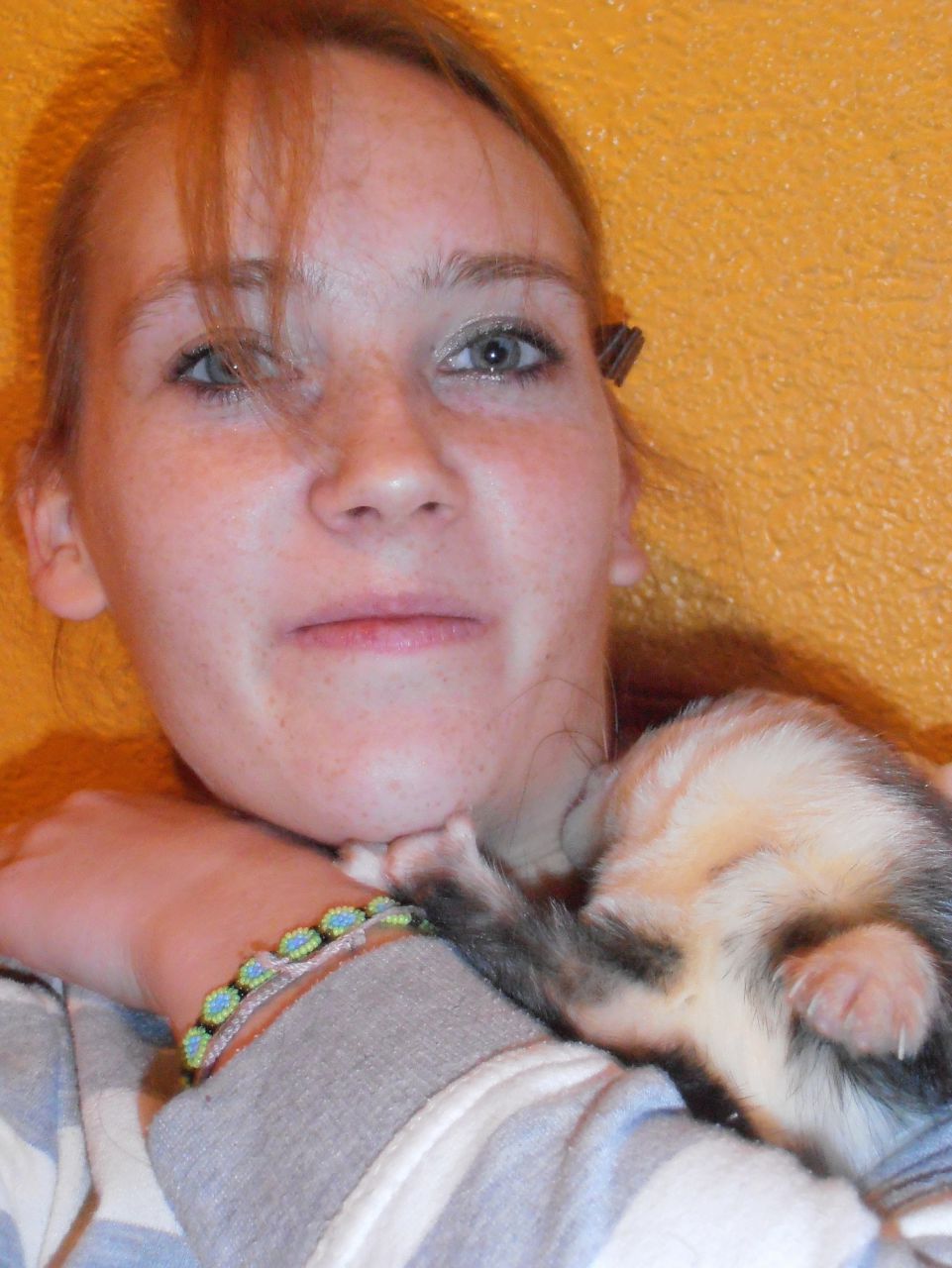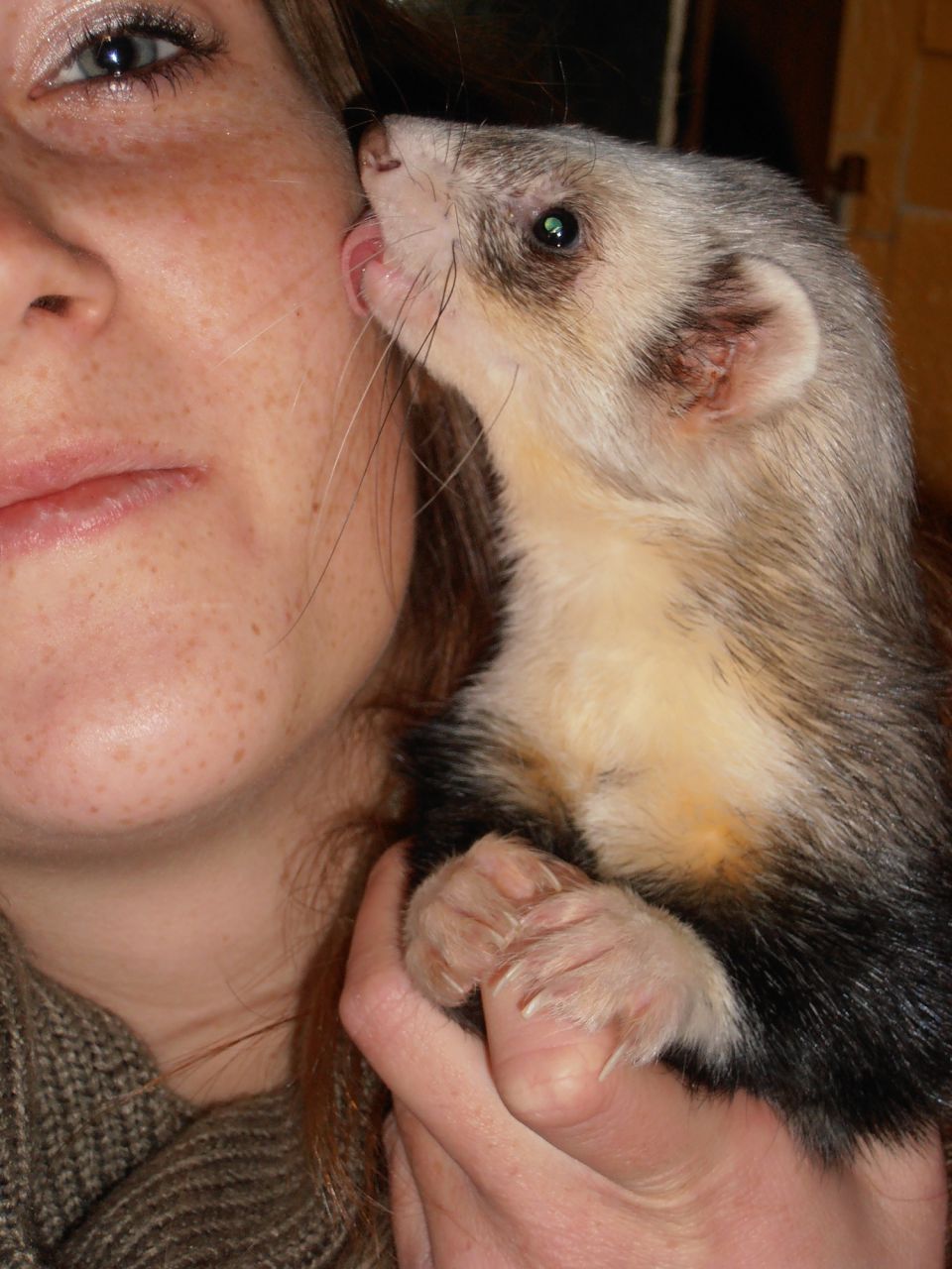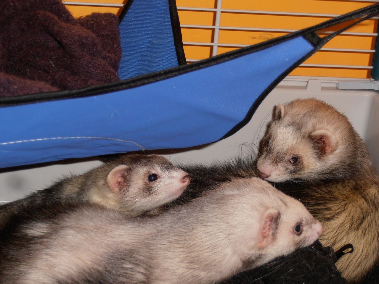 | Dire merci | Je crois que tout le monde n'est pas remis des reveillons , en tous cas Bonne Annee a tous(tes) bipedes et quadrupedes ! Dovah et Nesquik se ressemblent beaucoup, sur les photos c'est difficile de les distinguer . Les 3 comperes ont l'air de bien s'entendre, c'est un soulagement de plus . Mon furet en toujours en cours de traitement, samedi 11, 3 eme et derniere perfusion suivit de 3 semaines de laser; la tumeur a deja beaucoup diminue, je souhaite qu'elle continue sur le meme chemin; il sera peut etre alors possible de l'enlever et de la faire une cystologie qui nous donnera de precieuses informations sur la suite . Pour l'instant Cosmos a la forme, il mange, joue comme si de rien n'etait; juste un peu de fatigue apres le laser . |
