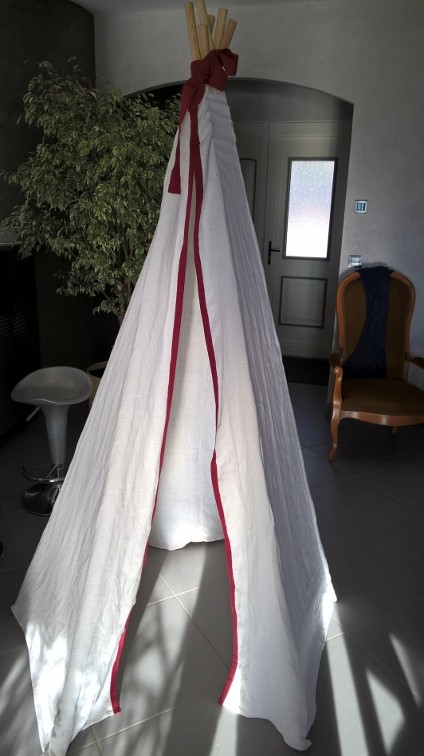 | Dire merci | Ici j'ai décidé de faire un tipi pour mes loulou en utilisant de vieux vieux drap de ma grand mère!! Heureusement que ma maman est (très) bonne couturière car c'était pas facile, mais je suis fière du résultat Avec un tapis, un plaid et des coussins tout doux, ils vont surkiffer j'espère!!! ![]() |