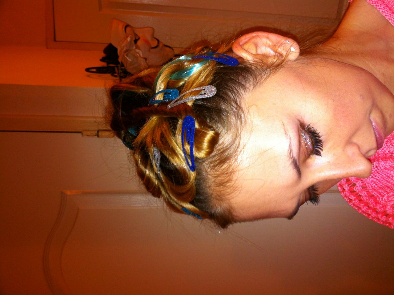 | Dire merci | lee j'ai finalement fait "soft",une queue de cheval haute,2 meches turquoises,meches de la queue tarabiscotées et clipsées avec des pinces a paillette sur le devant de la tete ![]() ct purement hideux |