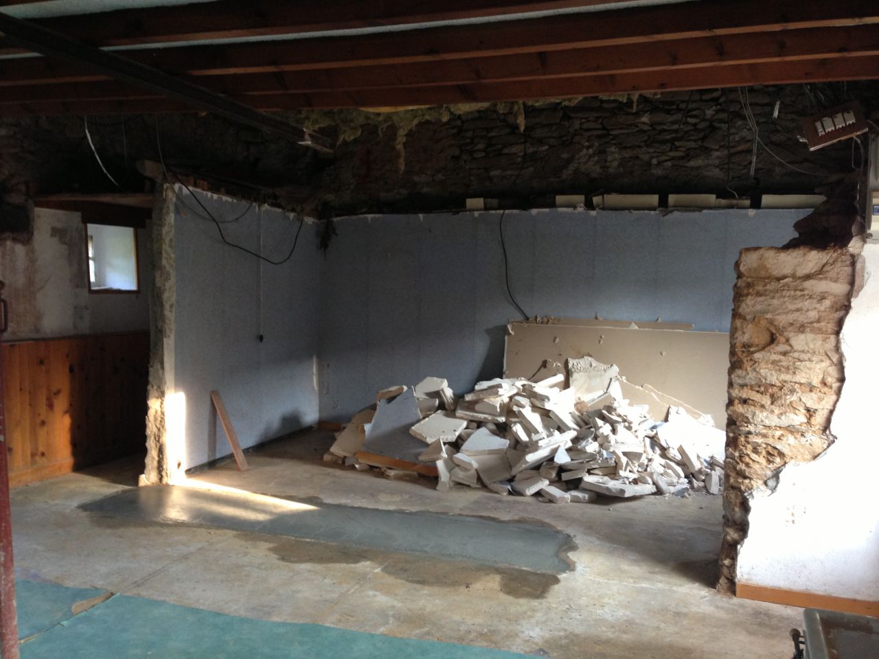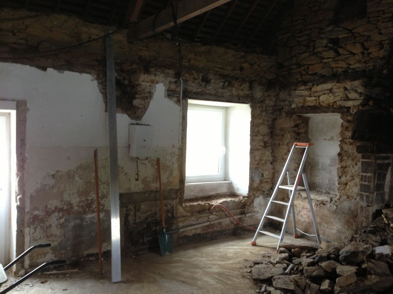 | Dire merci | Alors on attaque les travaux par le gros oeuvre! Au programme ,on fait tombé le mur entre le salon et la chambre ,toutes les autres cloisons . On ouvre une baie vitrée et une fenetre coté jardin ,et on ajoute un étage ,on fait une ouverture dans le pignon pour desservir les 2 cotés de l'étage et on refait également toute la toiture! Voila en image ![]() Donc abattage du mur entre le salon et la chambre ![]() une fois bien déblayée ![]() en parallèle on ouvre la baie vitrée et là on se demande si la maison va ^pas s'écrouler.. |