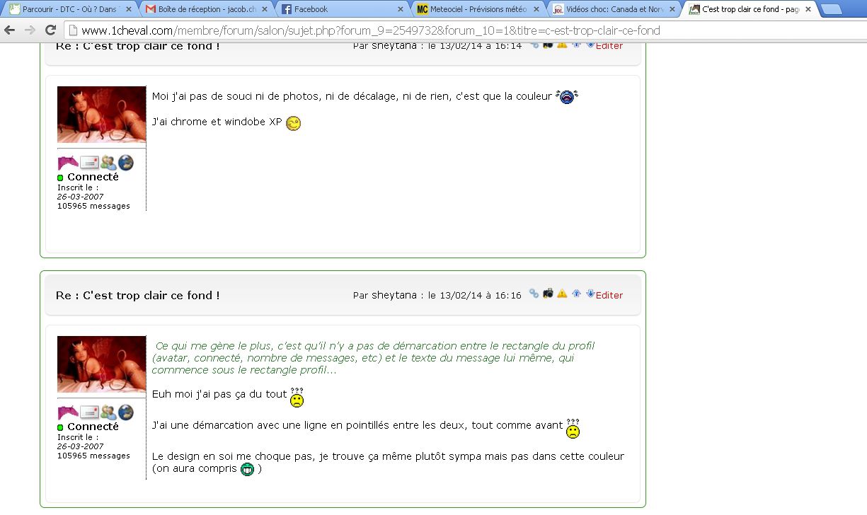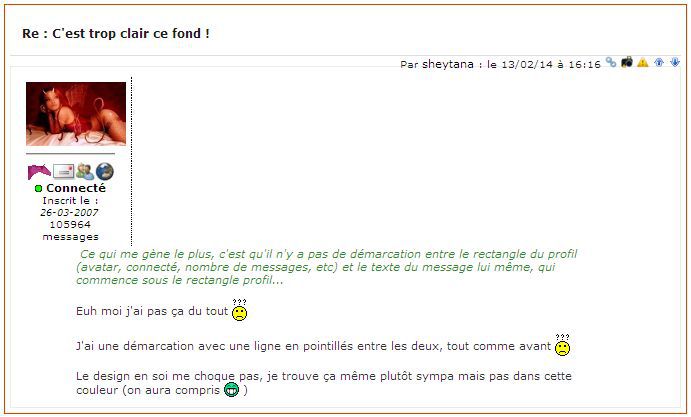 | Dire merci | Ce qui me gène le plus, c'est qu'il n'y a pas de démarcation entre le rectangle du profil (avatar, connecté, nombre de messages, etc) et le texte du message lui même, qui commence sous le rectangle profil... Du coup, c'est très gênant pour la lecture. Avant, on avait le texte du message à droite du rectangle profil, mais maintenant, c'est en dessous, du coup, ça laisse un grand espace blanc à droite du rectangle profil, ça fait beaucoup de place perdue.... |
