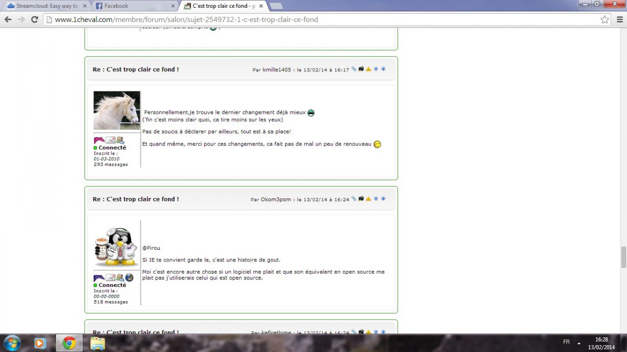 | Dire merci | Juste pour réagir de suite sur ce nouveau "fond" pour les messages, c'est trop clair on a du mal à différencier le fond du fond et les messages Message édité le 13/02/14 à 14:53 |