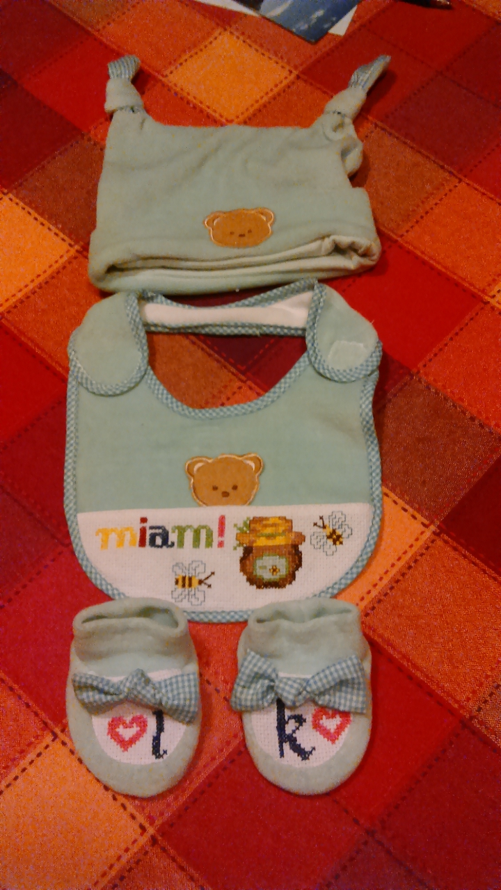 | Dire merci | J'aimais beaucoup broder mais je ne l'ai pas fait depuis des années parce que je ne sais pas quoi faire de mes réalisations. Je n'ai pas envie d'en faire des choses simplement décoratives. Vous pouvez me montrer des exemples de broderies "utiles", c'est à dire sur un objet qui sert réellement ? Comme le bavoir ci-dessus qui est très mignon ? Pas des mouchoirs parce que je n'en utilise pas. Des vêtements de bébé ? Des taies d'oreillers ? Des serviettes ? Quoi d'autre ? |