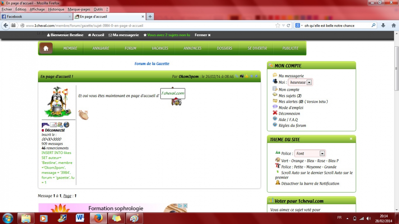 | Dire merci | okom3pom , par rapport aux tailles de police, j'ai tjrs le souci Quand je me connecte en tapant mon pseudo et MdP, je tombe sur la page "mon compte" dont la police est minuscule et pourtant, sur le forum, elle est normale (tu avais raison, ça a bien gardé mes préférences en mémoires, mais pq cette différence?) Et tu ne m'as pas répondu sur la possibilité de retomber direct sur le forum quand on se connecte, plutôt que sur "mon compte" ![]() |