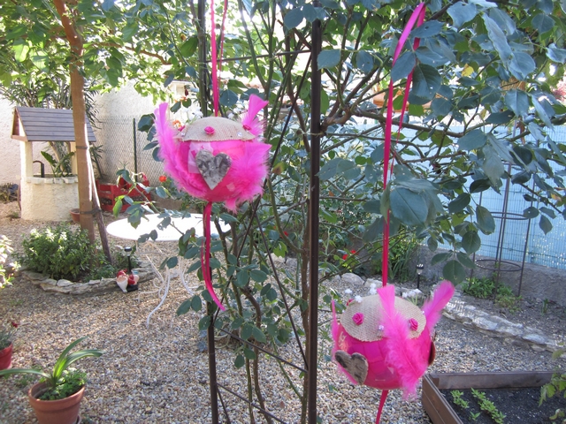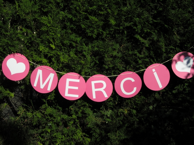 | Dire merci | Rooooo merci merci !Vous êtes trop gentilles !! Muse, merci beaucoup ! C'est vrai que ca nous reflète beaucoup ! Et je suis du genre a vouloir toujours récuperer/transformer/rénover ! Déja par soucis d'économie et aussi parce que j'avoue me sentir plus fière d'être arrivée a faire quelque chose d'unique et donc original Facettie je ne me voyais pas faire autrement en même temps ! hihihiPoonsy, c'est trop bien les virées Emmaus !! Dommage que chez moi ce soit un peu loin ! Remarque dans un sens c'est mieux j'y passerais ma vie Nezlaine, merci ! en fait je voulais inscrire " MR et MRS " sur nos sacs au chéri et a moi mais j'ai oublié le R sur le mien ! Je vais corriger ca mais je ne sais pas si j'aurais pas du faire les initiales comme tout le monde ... Yeahh trop bien ca Alber !! Tu dois te sentir soulagée d'avoir fini déja non ? Sinon ben ce week end, gros boulot démenagement/ménage pour le frangin ! Mais j'ai quand même réussi a aller dénicher aux puces mes 3 dernières assiettes pour le buffet ! ( je vous ferais des photos dans la journée) Et ce matin petites courses ! Comme toute la famille ne sera pas la, on veux faire une jolie photo avec une banderole " Merci" et leur envoyer pour les remercier quand meme d'avoir pensé a nous pendant les préparatifs et ce jour la ! J'ai donc pris 2 grandes feuilles ( fushia et blanc) mais aussi 2 grosses boules en polystirene pour faire des suspensions pour le buffet ! Un peu dans ce style la ![]() |