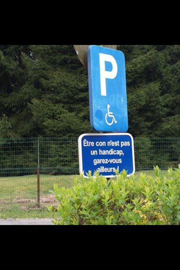 | Dire merci | Donc ces emplacements pour personnes handicapées sont absolument inutilisables par les chaisards, idem dans ma gare SAUF QUE handicapé c'est pas forcément fauteuil roulant! Et par principe si il y a bien des places que je ne prends jamais ce sont bien les places pour handicapés. J'avais bien aimé la pub qui disait "tu veux ma place, prend mon handicap" Ma gare c'est pareil, faut arriver mega tôt pour ne pas devoir se garer à 10 min : ben soit tu arrives hyper tôt, soit tu marches... |