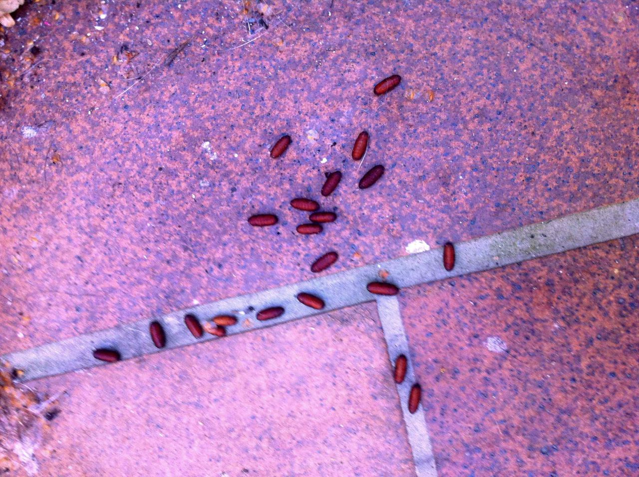 | Dire merci | Ce matin, grosse surprise dans la cour, des petits trucs rouges par terre. Impossible de savoir ce que ça peut bien être ! Directement, on a pensé à des crottes de rat (à cause de nos voisins, qui sont vraiment trèèèès sales!) mais en regardant bien on voit bien qu'elles sont toutes exactement de la même taille et toutes striées !Du coup, gros doute! Pour vous situer le truc, on a une toute petite cour (sans jardin) avec une petite "maison" (avec nos poubelles, notre lave linge...) La cour est collée à deux voisins, dont un qui laisse ses poubelles pendant des mois et des mois dans sa cour (il les sort 1 fois tous les 3 mois, et le trottoir en est rempli à ce moment là). Ils vivent avec deux chiens qui ne sortent JAMAIS (hors dans la cour la nuit, pour aboyer) et qui font leurs besoins à l'intérieur de leur maison (odeur insupportable bien sûr) La photo arrive (c'est loooong à charger) |