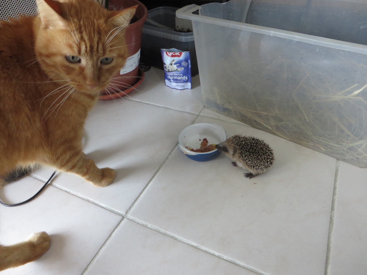 | Dire merci | Les chats ne gênent pas les hérissons, en général ils ne s' intéressent pas à ce truc qui pique. Ce qui est plus embêtant ce sont les chiens ... quoique ça dépend des chiens, en tous cas les miens n'y touchent pas. D'ailleurs il y a 2 ans un gros hérisson a squatté la niche de Tataye tout l'été ... et il se fichait complètement des allées et venues de tout le monde. |