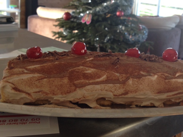 | Dire merci | ici les desserts sont presque fini ! une buche à la crème au beurre pour les gourmands (ça c'est zoom qui fait ) et pour ma part je vient de faire une buche au trois chocolats, génoise pistache ... j'ai dû recommencer 3 fois ma mousse au chocolat blanc, retourner en course, ... du coup ça m'a pris la journée ! |