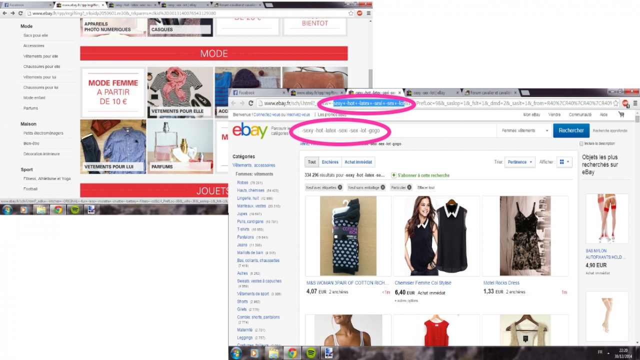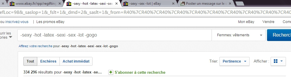 | Dire merci | En ce joli soir de 30 décembre me voilà prise d'une envie de geeker dans le vide. - Je vais donc sur Ebay. - Je vois une section "Revente de Cadeau". - Je clique en ouvrant un nouvel onglet sur la sous-section des sacs. - Et là je vois des mots clefs au contenu euh plutôt... inattendus! ![]() - Alors prise d'un doute je clique sur la sous-section des vêtements. - Et là je tombe sur encore plus de mots clefs... SEXUELS ![]() =>J'en reviens toujours pas. ![]() (Et puis regardez aussi ce que l'on trouve sur la droite dans les recherches favorites des internautes )![]() ![]() |
