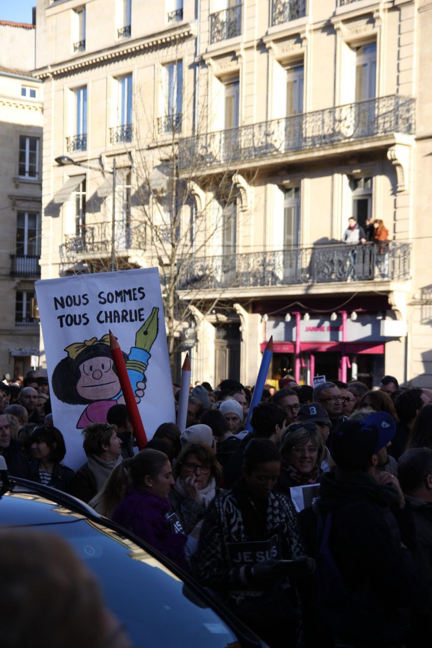 | Dire merci | Bonjour, finalement, nous sommes allés tous les 3 (avec ma fille de 3 ans) à la marche de Bordeaux. Un monde impressionnant mais vraiment calme, bonne ambiance, pas de récupération. Un vrai sentiment d'union. Du coup, nous avons fait toute la marche avec ma fille, en nous mettant plutôt devant sur un côté. Il y avait énormément de familles, des poussettes, des chiens...j'aurais regretté de ne pas y aller. Du coup, quelques photos: ![]() ![]() et puis ma fille, très fière d'avoir sa propre pancarte! ![]() |