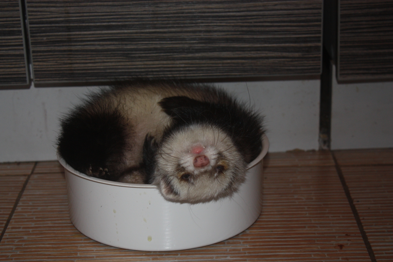 | Dire merci | Je plussoie fortement Chococrack! Je compare souvent mon furet à un chaton qui ne grandit pas. Il est à la maison en liberté dès qu'on est à la maison, et dans une grande cage à lapin la nuit et quand on s'en va. Niveau propreté, on a juste accepté de vivre avec des litières dans tous les coins de la maison ![]() Pour l'odeur, perso je trouve qu'il sent le pain d'épice... mais ça ne plaît pas à tout le monde, je dois avouer ![]() Il faut être intransigeant sur l'éducation par contre, parce que ça a des petites dents pointues et la morsure facile quand c'est petit. Ce sont des petites bêtes bien malines, très attachantes. Le mien est un vrai chien. Il vient quand on l'appelle et comprend très bien le "Non". Il sait que la bouffe vient du frigo. Dès qu'on ouvre ce dernier il se précipite et fait le suricate devant .Bon, et puis parce que ça manque de photo: |