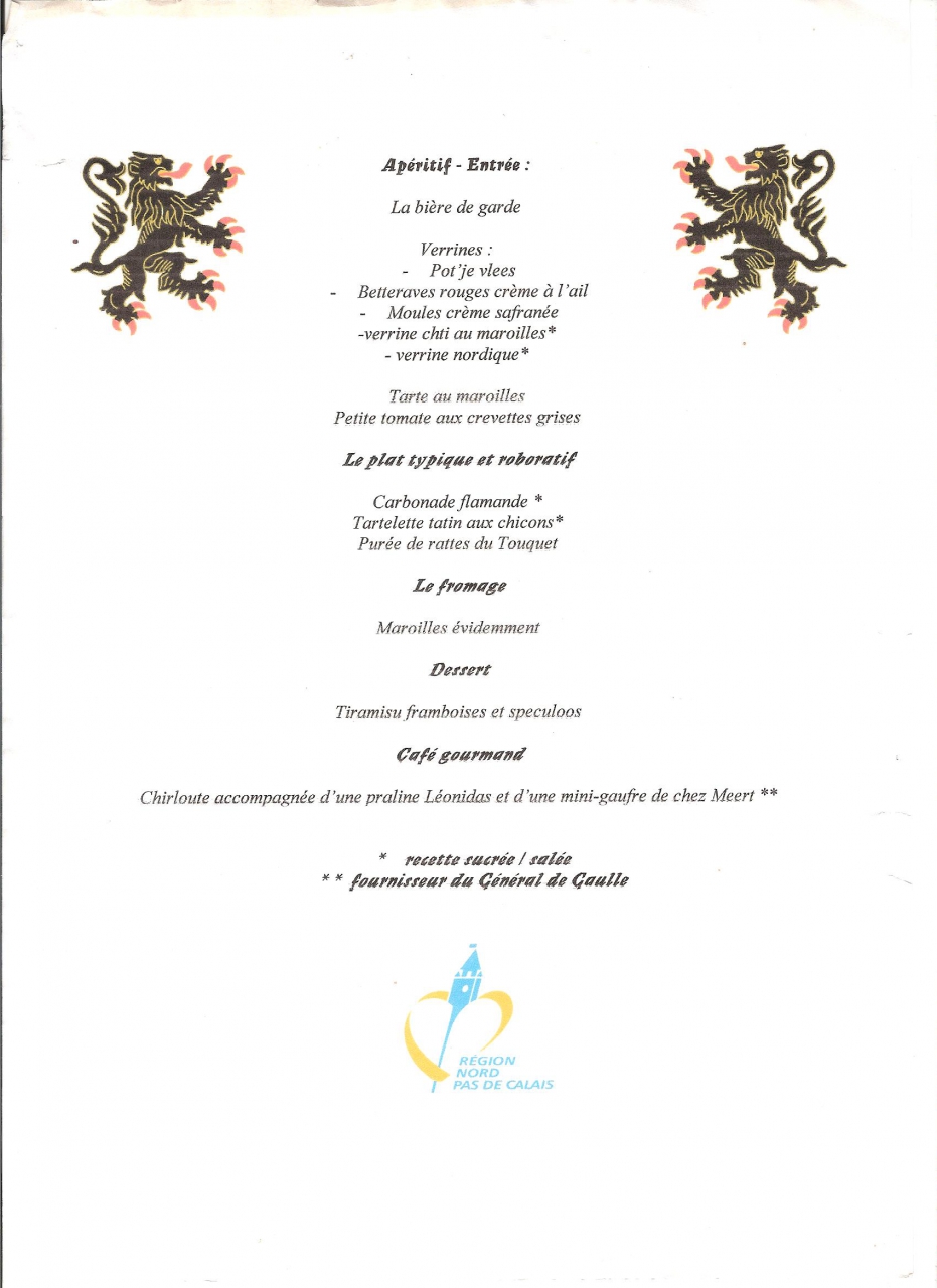 | Dire merci | si si il y a du vin de fait dans le 62 licques et pihen ils ont plantés des vignes il y a quelques années je garantis pas le cru par contre Sinon tu as aussi le gratin d'endive ... en entrée tu peux faire de la salade de hareng saur à l'huile ou du maquereaux cuit aux épices ou du saumon cuit aussi avec des épices le tout fait à Boulogne sur mer ... |
