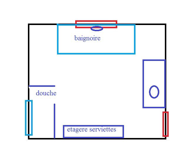 | Dire merci | Bonjour tout le monde! il y a quelques temps, j'ai créé un topic pour demander des idées pour la création d'un dressing, et vos suggestions m'avaient bien aidée. Aujourd'hui, j'aimerais renouveler l'expérience pour ma future salle de bain. quelques contraintes: - dimensions de la salle de bain: environ 4m X 4.50 - baignoire souhaitée - cabine de douche intégrale (cad un kit à monter, pas de carrelage à faire) - meuble et vasque simple mais large de préférence) La pièce est quasi carrée, avec une fenêtre au milieu d'un des grands côtés. La porte serait sur l'un des petits côtés. ça vous inspire? en très grossier, le plan ressemble à ça, avec en haut la fenêtre, en bas à droite la future porte, et en bleu les arrivées d'eaux de la sdb du dessous ainsi que les évacs, histoire de localiser ce qui nous faciliterait la vie ![]() Message édité le 26/07/15 à 16:24 Ce message a été modifié par un modérateur. |