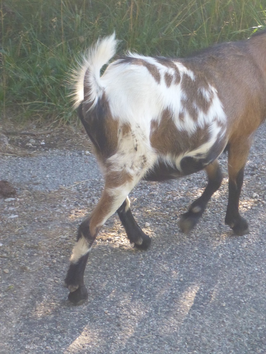 | Dire merci | J'ai acheté une petite chèvre naine dans une foire il y a deux mois de ça (le 29 avril si mes souvenirs sont bons), on nous a dit qu'elle avait 6 mois. Depuis quelques temps elle a grossis. Jusque là rien d'anormal, elle passe ses journées à manger et à faire du gras avec le cheval. Mais ces derniers jours on a remarqué qu'elle faisait du pis. Comme elle était dans un gros troupeau de chèvres / bouc avant de venir chez nous, la possibilité qu'elle ait été saillie n'est pas totalement à exclure. Sachant que pour simplifier le tout elle ne se laisse pas attraper. Y aurait il des connaisseurs des chèvres qui sauraient juger d'après photo si on s'inquiète pour rien ou pas? |