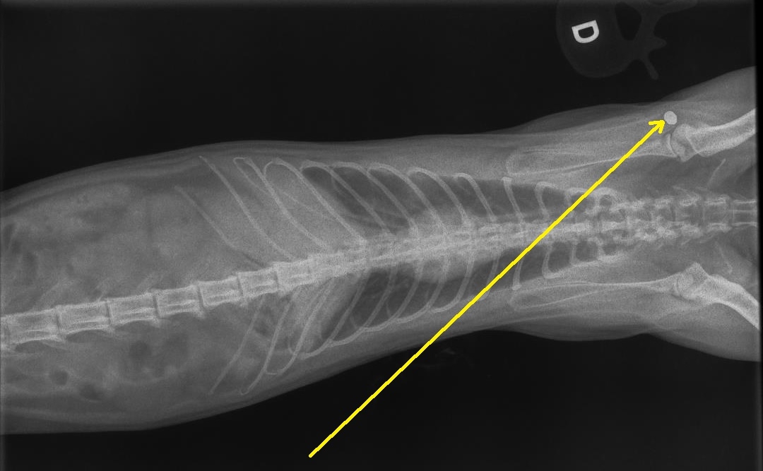 | Dire merci | On avait tiré à la carabine à plomb sur mon chat... Rien de grave, du petit plomb de foire. Enfin, il avait quand même un plomb planté dedans mais ça c'était arrêté à la peau. C'est le véto qui l'avait trouvé lors d'une visite pour tout autre chose. C'est stupide mais "bénin", il aurait fallu un malheureux hasard pour que mon chat soit blessé gravement par ce type de plomb. Rien à voir avec la volonté claire de tuer dans les radios montrées. |