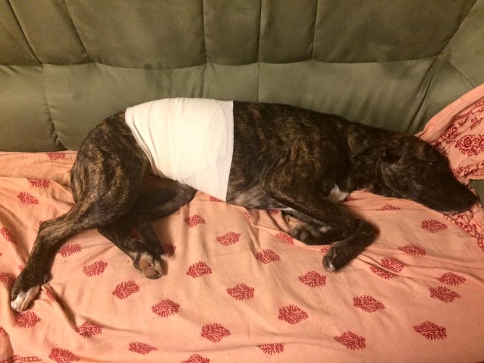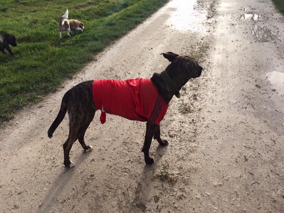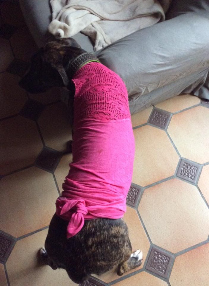 | Dire merci | Une petite photo de Lorka hier !!! Ne pouvant pas la l'aidait enfermer pendant 10jours, hier pour aller au cheval, je l'ai donc "déguisé" pour l'occasion ![]() " alt="" /> Donc pour protéger le pansement j'ai mit un sac poubelle et ensuite un débardeur pour tenir le tout |