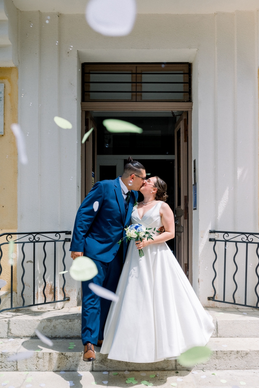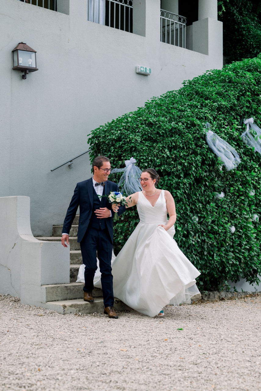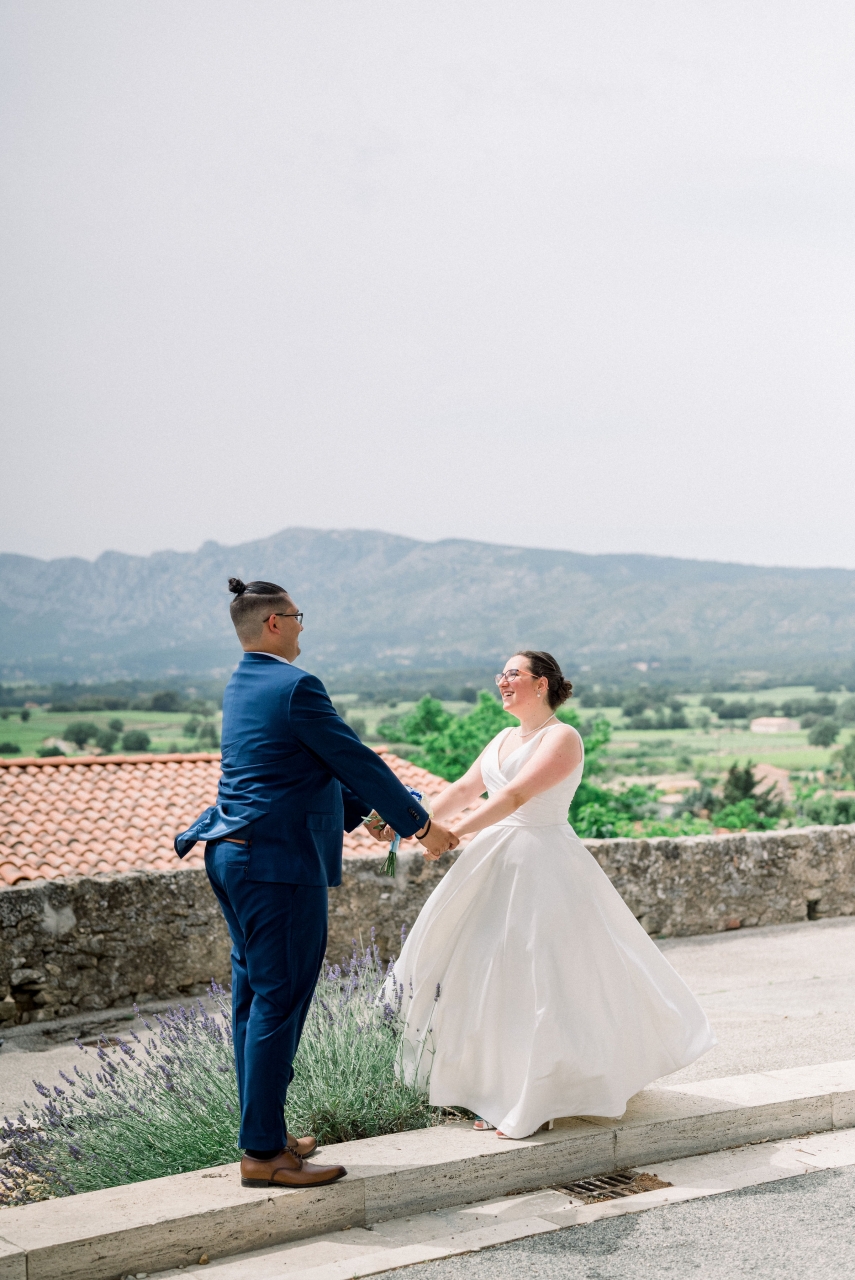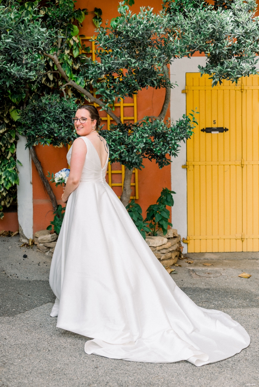 Je me suis préparée au domaine de la salle de réception, avec mes deux témoins et ma maman, alors que mon conjoint se préparait chez lui (dans le même village que la mairie où l'on s'est marié) avec l'un de ses témoins et ses grands-parents (son autre témoin, sa soeur, était avec sa mère pour décorer l'extérieur du domaine de réception pour nous faire la surprise, et ensuite elles ont dû se préparer elles aussi). On a bien rigolé avec mes témoins (ma soeur et ma meilleure amie), c'était ambiance légère, malgré un coup de stress en sortant la robe de son fourreau quand j'ai réalisé qu'il manquait l'une des pressions invisibles qui servait à replier la traîne de ma robe sur elle-même (tant pis, mais sur le coup j'ai paniqué). Beaucoup de larmes quand j'ai enfilé ma robe, et des photos rigolotes également, mais je ne mets pas celles où les invités etc sont identifiables ![]() ![]() ![]() Je voulais coudre notre coussin à alliances, au final mes compétences en couture ne me le permettaient pas, mais je l'ai brodé au point de croix et c'est une amie (et cousine de mon mari, qui a aussi été notre "dame marieuse" pour la cérémonie laïque) qui l'a tout assemblé Mon beau-père (mari de ma maman) et mon petit frère sont venus me "découvrir", là encore beaucoup de larmes ![]() (Bon là photo permet surtout de voir la coiffure ...) Puis mon beau-père m'a emmenée en voiture dans notre lieu de "découverte" avec mon conjoint, en sortie du village où on s'est marié, pour une rencontre en toute intimité j'étais avec mon conjoint pour son costume, le gilet a été rajouté par la suite, je ne l'avais pas vu porter l'ensemble mais c'est tout. De son côté, je lui avais montré la photo de la robe sur internet avant que j'aille l'essayer pour savoir si elle lui plairait, mais c'est tout, donc surprise totale (sauf la coiffure qu'il avait vue à l'essai).![]() ![]() Ma belle-mère nous a rejoints avec ma fille pour des photos tous les trois, puis elles sont réparties en direction de la mairie, et c'est mon beau-père (le papa de mon mari ce coup-ci ) qui nous a emmenés à la mairie pas de mariage ni avant ni après donc on n'était pas pressé par le temps (dixit le maire).Le maire connait très bien la famille de mon mari donc c'était un peu "personnalisé", mais léger. On a choisi de ne pas échanger les alliances à la mairie, donc seulement les signatures à ce moment là. On est entrés sur "I Think I Wanna Marry You" de Bruno Mars (on ne trouvait pas ce qui nous plaisait, mais c'était très bien) et on est sortis sur "Wonderwall" d'Oasis ![]() Ensuite on a fait quelques photos de couple au coeur du village (où on s'est marié mais surtout où on a grandi tous les deux) ![]() ![]() ![]() (La Sainte Victoire en fond) ![]() Puis retour à la mairie où on avait laissé la voiture, et là, malheur voiture hybride, il faisait un peu chaud, mon beau-père avait oublié les warning ... On ne redémarre pas sachant que beaucoup d'invités avaient pris la route vers le domaine de réception sur notre demande pendant nos photos. J'ai dégaîné mes câbles du coffre de ma voiture (que ma belle-mère avait prise pour emmener ma fille car siège auto dedans), ça ne marche pas. Un ami qui a une belle voiture était encore là, on prend les fleurs de la voiture d'origine et on les met sur la sienne, il devient notre chauffeur puis le grand-père de mon mari arrivera pour charger la batterie de la voiture d'origine qui nous rejoindra plus tard. |
