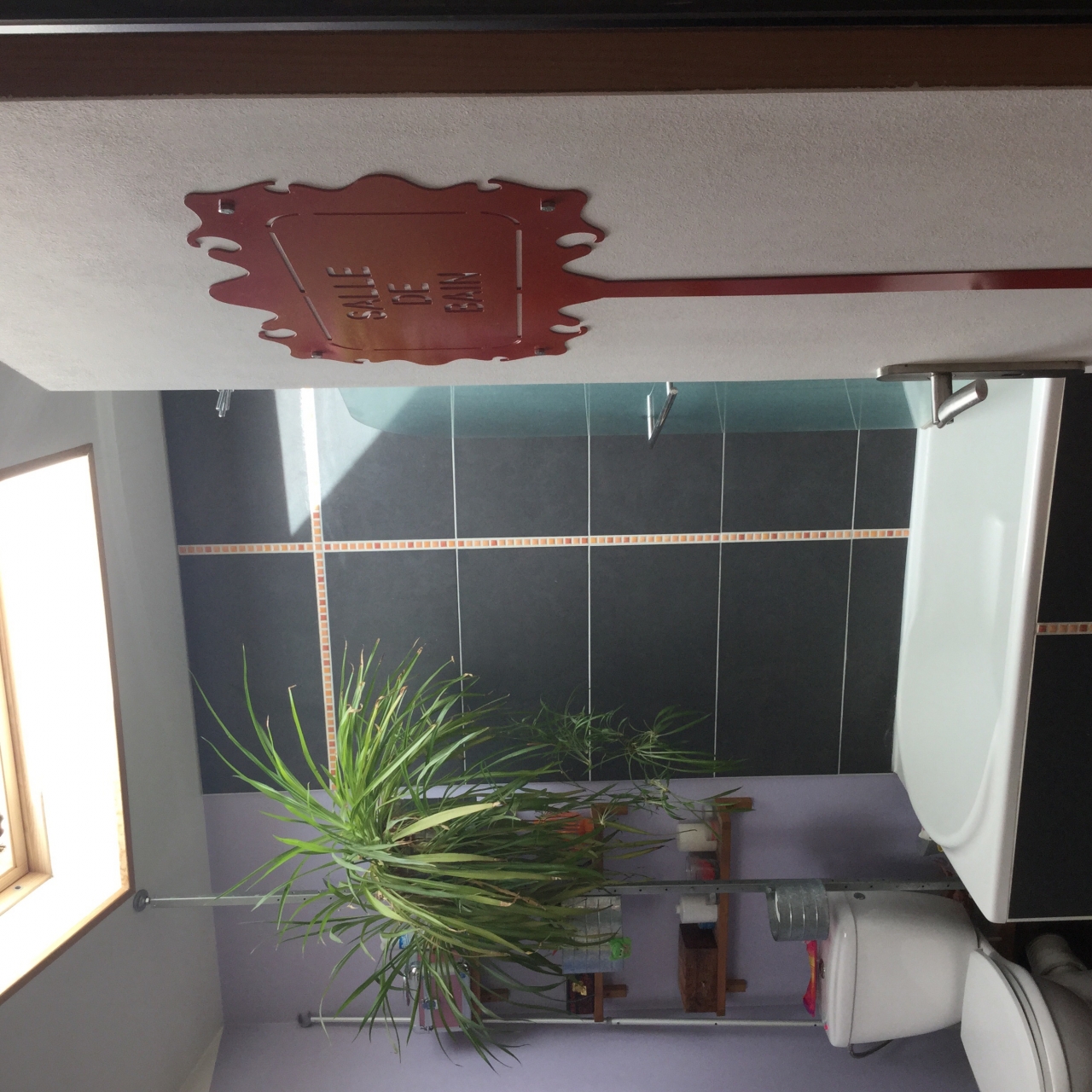 | Dire merci | Par contre la porte ... Comme c'est du bois exotique massif, qu'on a entièrement fabriqué à partir de planche... Ca nous faisait trop mal de la peindre !! Et la SDB ![]() |