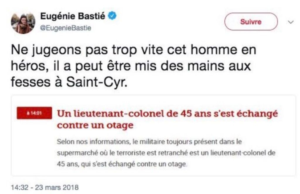 | Dire merci | Dans le style, il y a aussi cette grosse conne d'Eugénie Bastié (je ne peux pas la blairer, désolée ) qui en a sorti une bonne... mais bon, il parait que c'était de l'humour .. c'est vrai que c'est une actualité qui s'y prêtait bien ... ![]() |