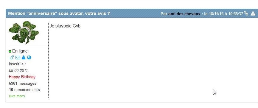 | Dire merci4 | Un détail un peu futile soit, mais par ces temps qui courent, un peu de légèreté ne nuira pas : C'était en soi une bonne idée de diminuer la taille du pavé sous l'avatar, ok. Cependant, la seule mention qui apparaisse désormais est la mention "en ligne" et je trouve dommage que le "joyeux anniversaire" ne soit plus visible le jour J mais reste caché tant qu'on ne clique pas sur l'avatar, ce qu'on ne fait pas à tout bout de champ ! En cliquant par hasard pour voir si c'était un garçon ou une fille, j'ai vu que c'était aujourd'hui l'anniversaire d'eclair ( joyeux anniv au passage ) En résumé : j'aimerais un peu de convivialité dans ce monde de brute, okom3pom si tu passes dans le coin, y-a-t-il moyen d'arranger ça ? Vous en pensez quoi les forumeurs? me fourre-je le doigt dans l'oeil ?? (je sais c'est fourré-je mais c'est moins rigolo ) |