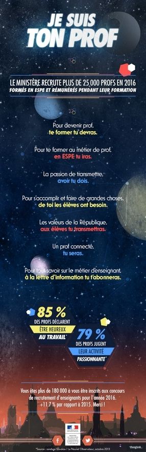 | Dire merci | Ce qui est sûr, c'est que dans les matières porteuses d'emplois (svt, math, etc.), non seulement il y a beaucoup de contractuels, mais il va y en avoir bcp plus. Entre: - le mépris affiché d'une partie de la population envers le métier; - le mépris avec lequel l'Éducation National vous traite; - les mille et une réformes réalisées par des gens bien-pensant qui n'ont aucune idée de ce que c'est que de se retrouver devant non pas 1 mais 30 élèves dont pas un seul n'a la même motivation, les mêmes difficultés, les mêmes acquis, etc. - le manque de formation (ah si, c'est année, on va en bouffer de la formation pour mettre la réforme en place. Pour la formation permettant d'aider les élèves : NÉANT) Mais bon, l'EN fait malgré tout ce qu'elle peut pour recruter : [non, ça n'est pas une parodie, c'est une affiche officielle, je tiens à le préciser] |