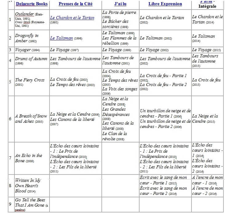 | Dire merci | Dans tout ce qui suit "Voyager", j'ai failli décrocher 30 fois (même la fin de Voyager d'ailleurs, dès qu'on quitte l'Ecosse snifff) et comme toi Coralie, quand ça guimauve, ça agace ...MAIS... cette folle d'auteur arrive toujours à placer de l'Histoire (avec un grand H), de la vie quotidienne décrite aux petits oignons (parce que vivre et survivre au quotidien à l'époque et à ces endroits ce n'était pas de tout repos) Bref, il m'arrive de sauter des passages mais je veux toujours savoir ce qui va se passer après Et puis j'ai eu du mal, mais à un moment j'ai fini par m'intéresser à R et B même si au début je sautais tous les paragraphes "contemporains" |