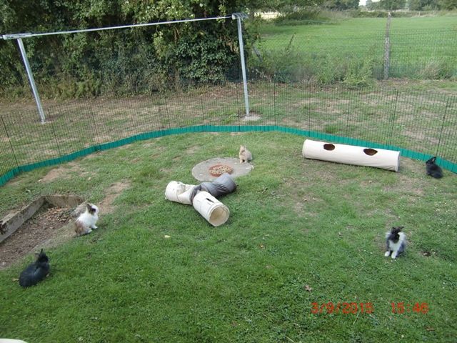 | Dire merci | Je ne biberonne pas mes bébés lapins et ils sont super mignons pour autant je pense que ce qui est important, c'est de bien les manipule tous les jours, avec douceur, ce qui se passe quand on les biberonne. Je passe pas mal de temps avec mes lapins je les prends, les sorts, les reprend, ne serait ce que pour les mettre au parc dehors (car il n'y restent pas la nuit, trop peur qu'il se fasse prédater). leeloye j'ai testé plusieurs choses : le filet à lapin. Pratique à poser et à déplacer, le hic, c'est que mes lapins passent en dessous même si je l'électrifie. Voici ce que ca donnait, tu notera la présence de bébés en dehors du parc : ![]() Le grillage, c'est bien mais ce n'es tpas amovible et il faut l'enterrer pour que le lapin ne passe en dessous. J'ai donc opté pour ce parc : Lien. Inconveniant, mes tous petits (moins d e3 mois en races naines) passe au travers des barreaux. J'ai donc mis une protection en pastique : ils le grignote. Ca donnait ca : ![]() sur la photo, il y a plusieurs parcs combinés entre eux. Le gros avantage est de pouvoir facilement déplacer ces parcs pour les mettre dedans, dehors, proposer de la nouvelle herbe fraiche... Aujourd'hui, je choisi donc de doublé ce parc de petites grilles fines (dispo aussi sur zooplus) spéciale souris pour mon parc "nurserie". Ca donne ca : ![]() j'aménage le parc avec des tunnels, des cachettes, des cartons dans lesquels je fais des trous... |