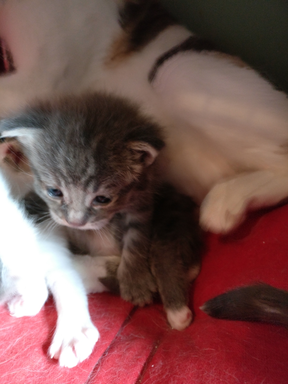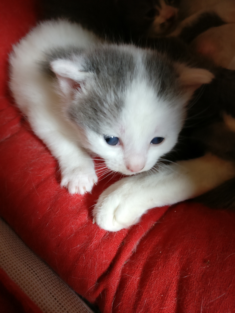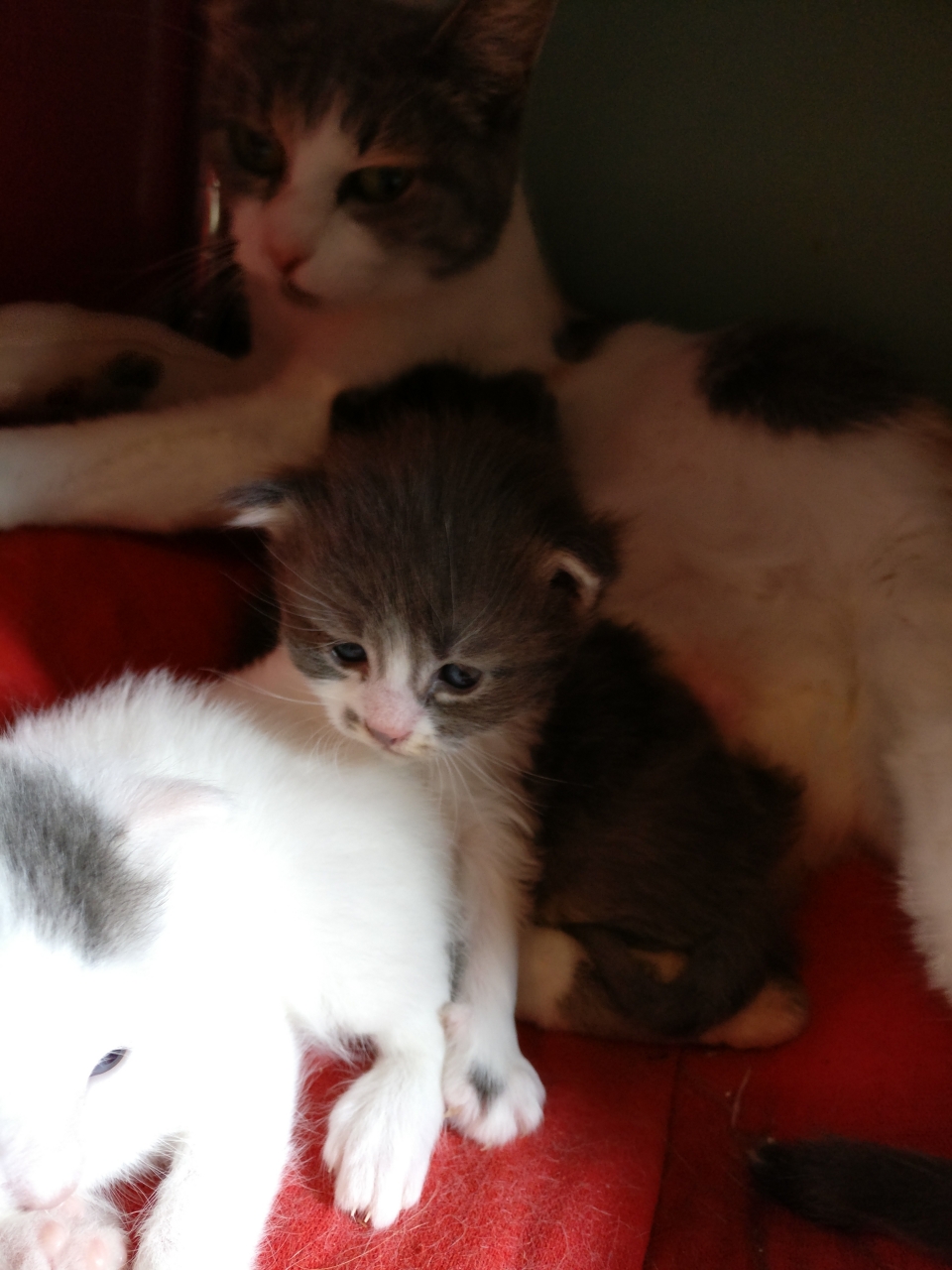 | Dire merci | même pas,ils sont dans le garage avec un petit radiateur aha! on a prévu de les rentrer dans une chambre mais je sais pas quand encore. la petite grise s'est couchée contre moi tout a l'heure pdt que je câlinais la maman, et que les 2 autres se bouffaient le pif avec leurs mini dents mais clairement,m'en séparer va etre dur,surtout de la grise et blanche |