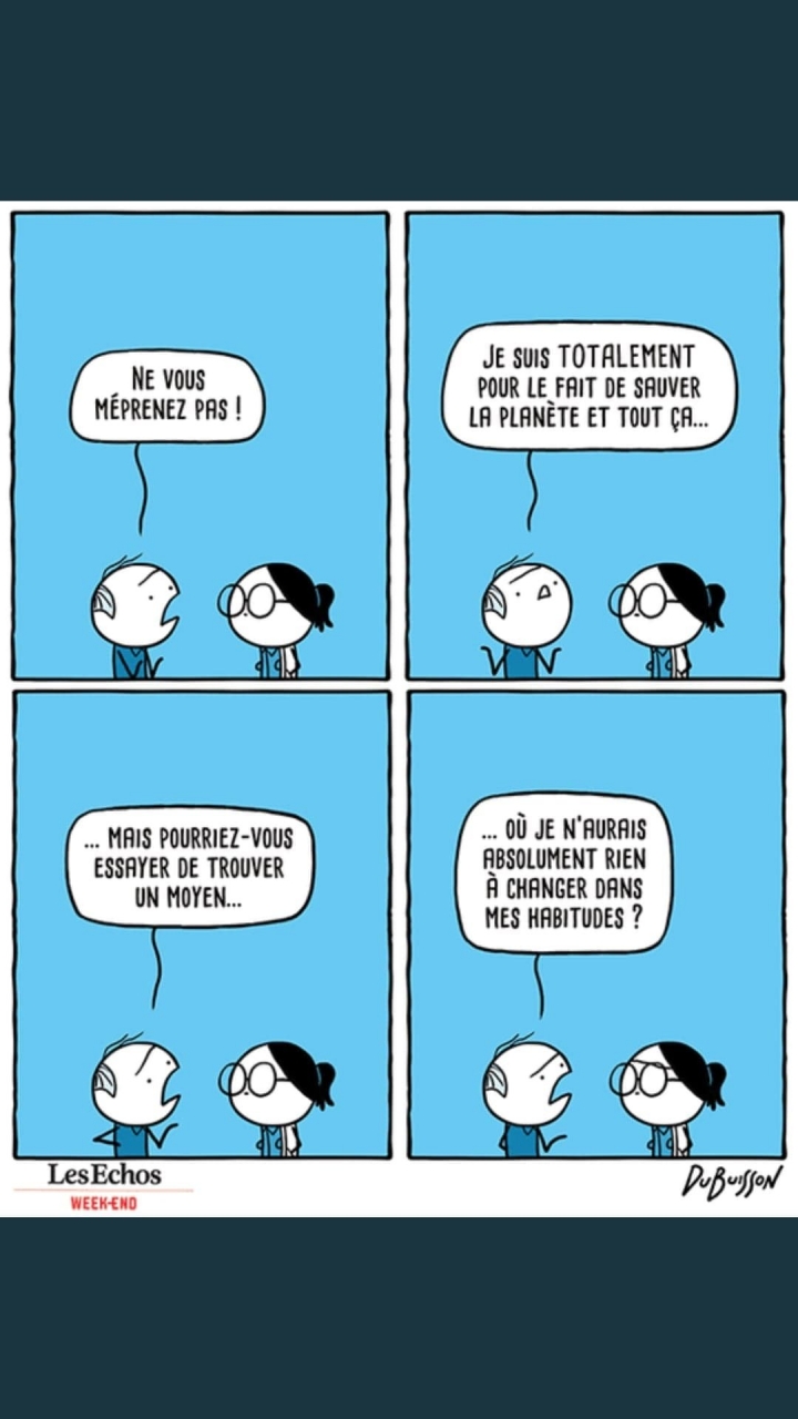 | Dire merci1 | Comme je l’ai déjà écrit mais je vais le réécrire une énième fois, tout ce que vous préconisez ne servira à rien suffit d’aller voyager en Inde pour s’en convaincre Des choses pour la Terre j’en fais plein, pas les mêmes que vous c’est tout et bien plus efficaces selon moi. Clairement, tes connaissances en écologie sont lacunaires. Ce n'est pas grave, mais du coup je t'invite à ouvrir tes chakras et à te renseigner un peu sur le sujet, car ton "selon moi" risque d'être fort biaisé. Le site Bon Pote est très bien fait pour avoir un aperçu vulgarisé (mais très bien documenté) des problématiques liées au climat : Lien |
