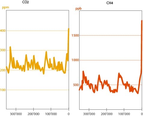 | Dire merci | uriette , si on s'intéresse aux derniers 300 000 ans, depuis l'apparition d'Homo sapiens, on voit que de nombreuses variations environnementales ont existé, il y a même eu un petit âge glaciaire dans nos régions, etc. Mais là, on est en train de transformer la planète dans sa globalité en un environnement que l'humain (et les espèces liées) n'a jamais connu, et à une vitesse folle, ne laissant aucun temps à l'adaptation. Regarde par exemple l'évolution du CO2 et du méthane (CH4, un gaz qui a un effet de serre 30x plus grand que le CO2 quantité égale) dans l'atmosphère (graphes faits par moi-même avec les données du Dôme C de l'Antarctique) : ![]() |